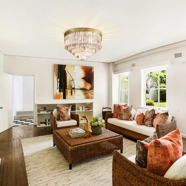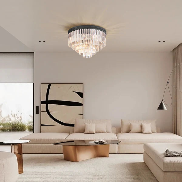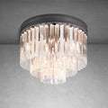 | Inspired by the Art Deco Round Flushmount style of 1920s Paris, the collection captures the period's fascination with geometric forms. Masterfully refracting the light, hundreds of faceted, dynamic prisms evoke the allure of the era. Hanging like lush fringe from a welded iron frame, the angular glass juxtaposes elegance and industrialism. |