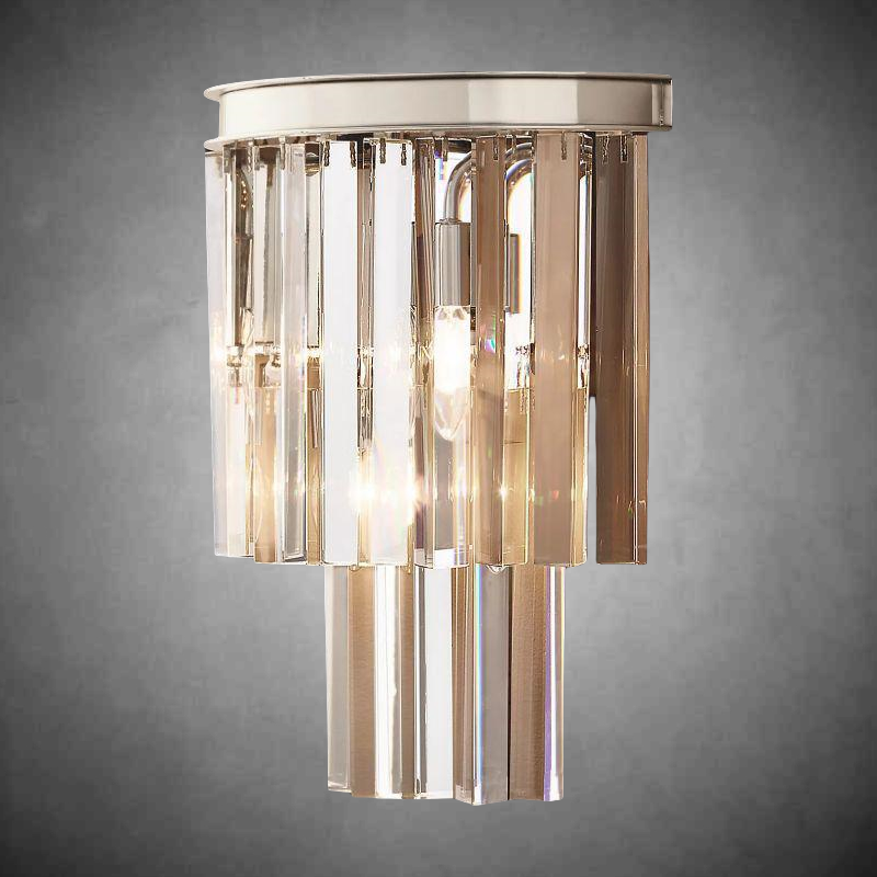 | Inspired by the Art Deco style of 1920s Paris, the collection captures the period's fascination with geometric forms. Masterfully refracting the light, hundreds of faceted, dynamic prisms evoke the allure of the era. Hanging like lush fringe from a welded iron frame, the angular glass juxtaposes elegance and industrialism. |
