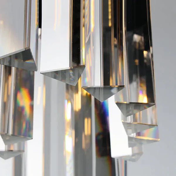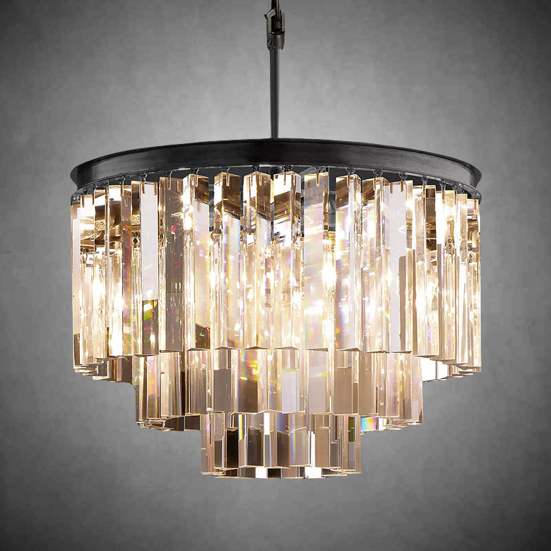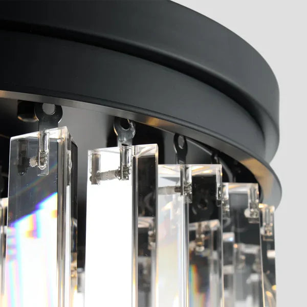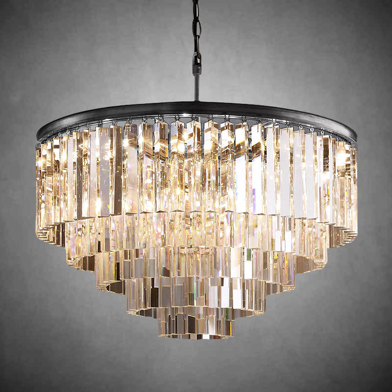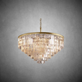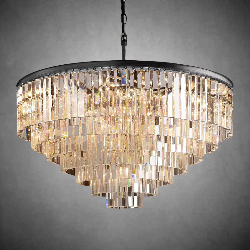 | Inspired by the Art Deco Round Chandelier style of 1920s Paris, the collection captures the period's fascination with geometric forms. Masterfully refracting the light, hundreds of faceted, dynamic prisms evoke the allure of the era. Hanging like lush fringe from a welded iron frame, the angular glass juxtaposes elegance and industrialism. |