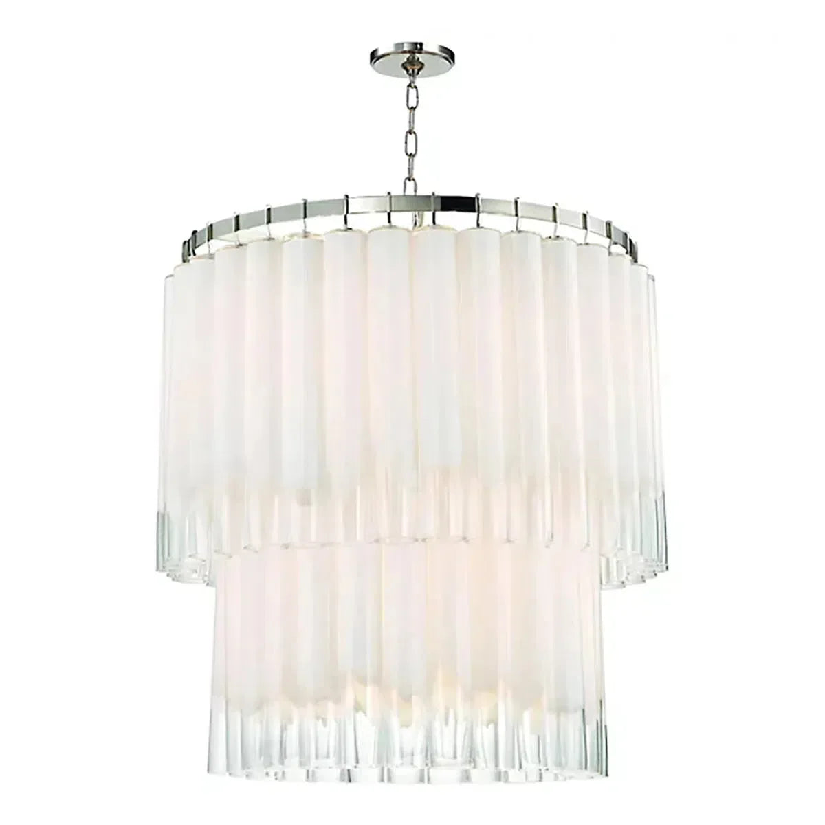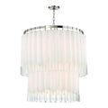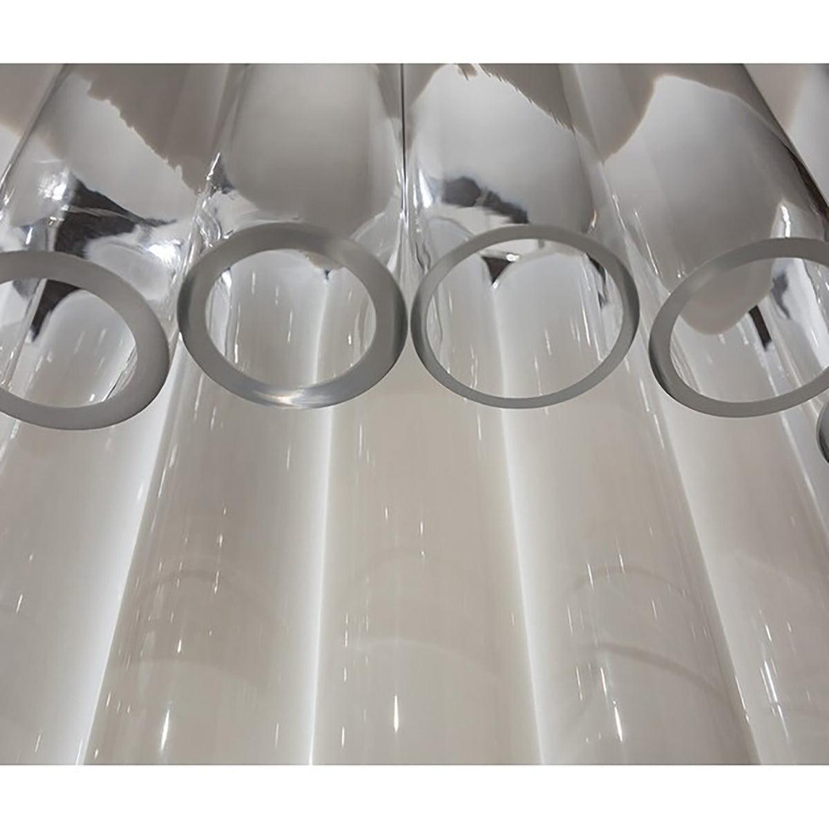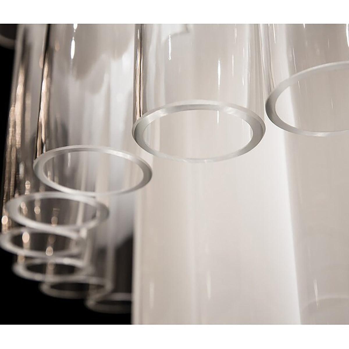 Each of the glass tubes in the Morna chandelier is imperfect, frosted opalescent at the top and perfectly clear at the bottom. The sheen of the outer layer gives them a glossy sheen that creates a mysterious and seductive diffused effect as light streams from candelabra bulbs perpendicular to each layer of glass tubes.Morna adds a 21st-century twist to a modernist classic.