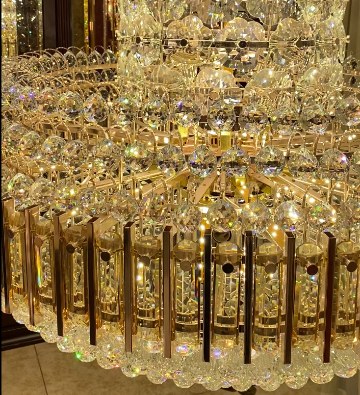This luxurious 3-layer crystal chandelier is perfect for large foyers, hallways, entryways, and staircases. It features an extra-large crystal chandelier with clear crystal balls, crystal slices, and gold-plated crystal pineapple balls, ensuring a uniquely elegant look. This designer recommended light fixture is ideal for two-story and multi-story houses, as well as foyers, entrances, living rooms, large halls, restaurants, cafes, bars, and hotels.