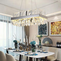 | Spectacular rectangle modern crystal chandelier that is sure to be the capstone of your dining room's decor! The exquisite craftsmanship throughout the design is sure to dazzle and captivate everyone who sees it. Made of polished steel, this fixture comes in gold color or chrome. Attaches to the ceiling with a flush mount and uses LED lights. |