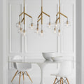 The Sedona Triple Chandelier is the ideal fixture for a modern deconstruction of the classic chandelier. The chandelier consists of three glass spheres, each suspended from a dendritic centre pivot by contrasting fabric cords. The spheres have a smooth outer surface and a thickened band of glass on the inner surface.