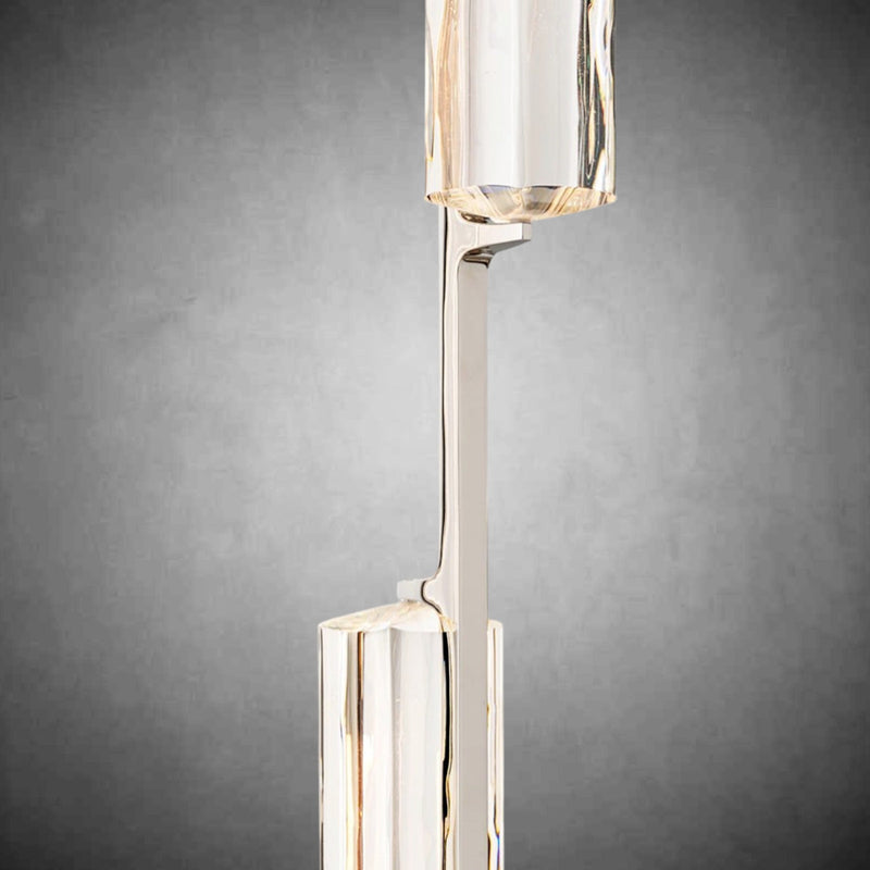 Capturing the spirit of 1960s Italian minimalism, Audubany appears to cascade from above with ten prisms of hand-polished K9 crystal on vertical brass drops. At once striking and restrained, the collection by Joseph Jeup evokes the warmth of candlelight with elongated LEDs that shed beautiful light through the undulating texture of the glass.