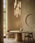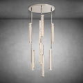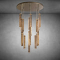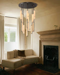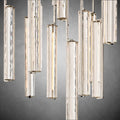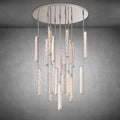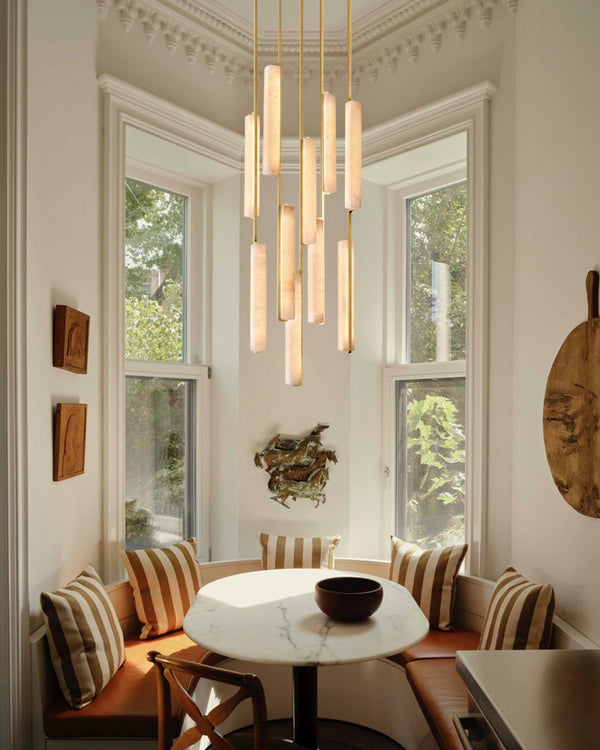 Capturing the spirit of 1960s Italian minimalism, Auduban appears to cascade from above with 18 prisms of hand-polished K9 crystal on vertical brass drops. At once striking and restrained, the collection by Joseph Jeup evokes the warmth of candlelight with elongated LEDs that shed beautiful light through the undulating texture of the glass.