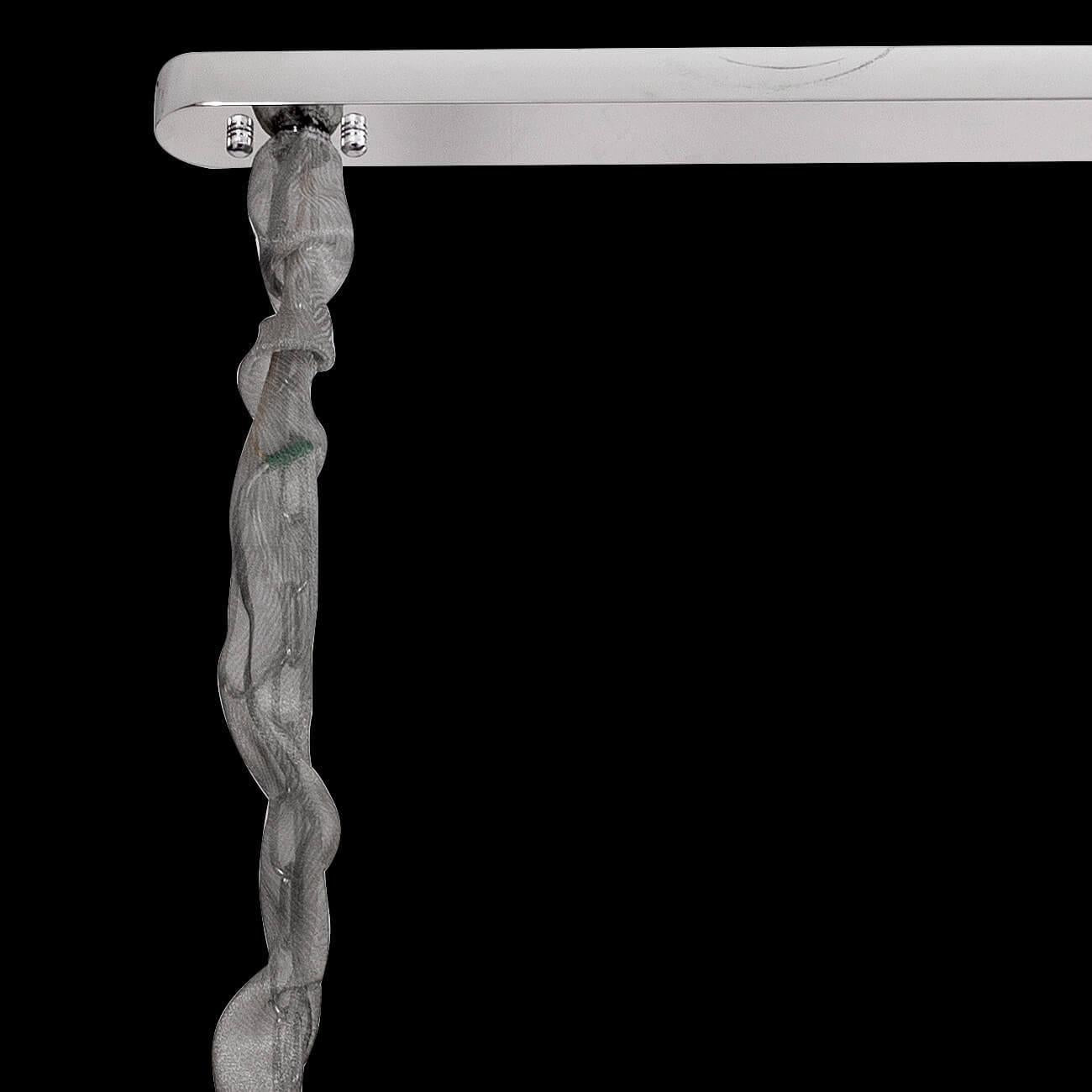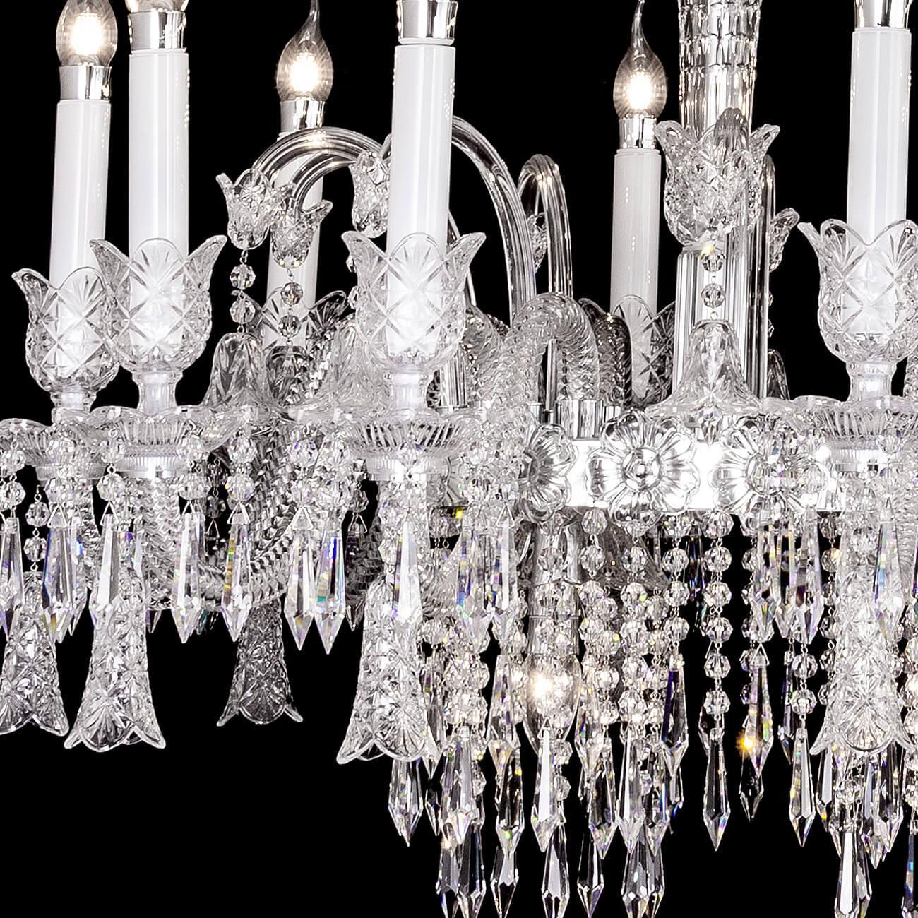 Composed of asfour crystal and 24pb glass. The materials converge to create a stunning interplay of light and clarity. The 14 lights. Compatible with e14/e12 bulbs. Cast a warm glow. Elevating the ambiance of your space. Finished in chrome. The metal accentuates the clear color palette. Contributing to its contemporary allure.