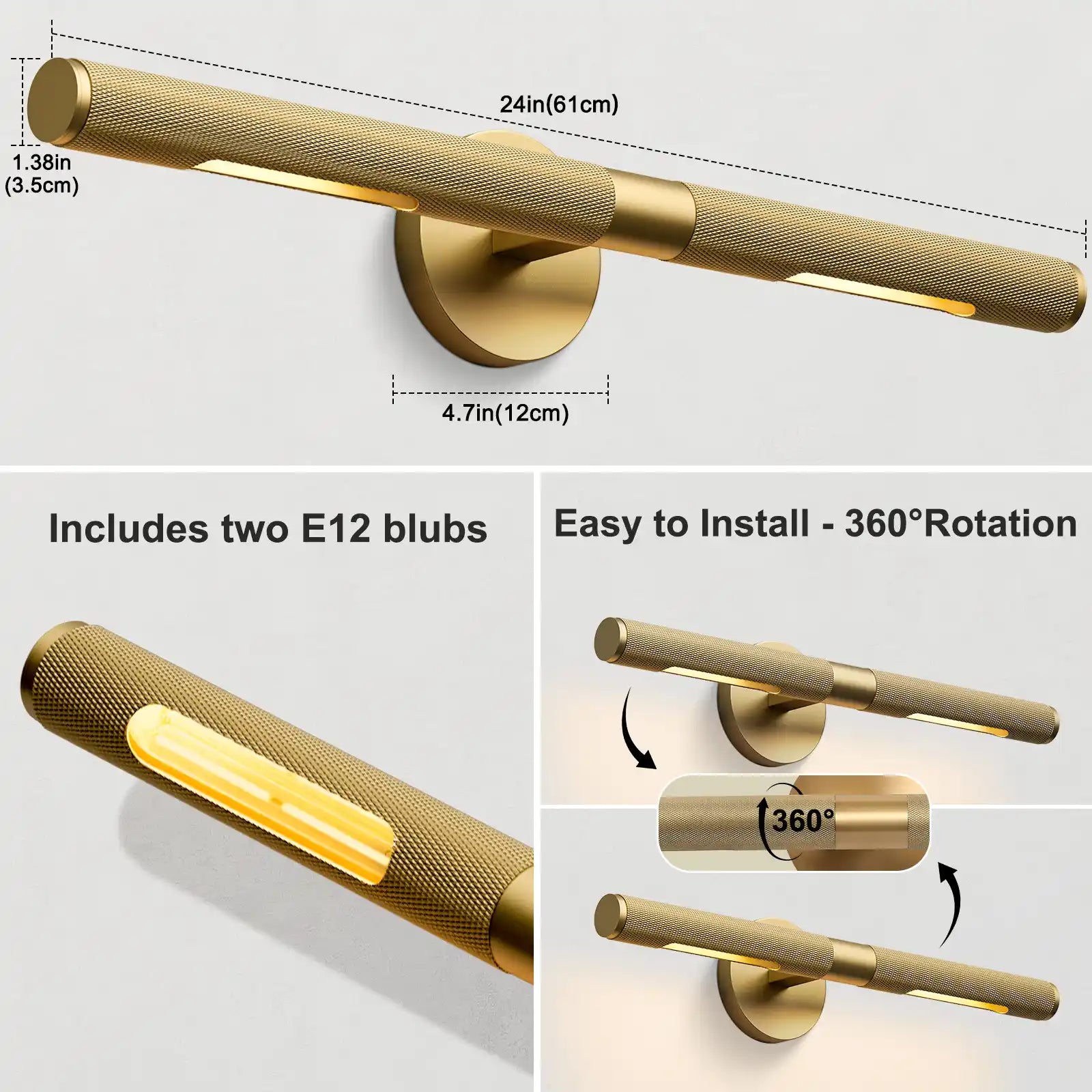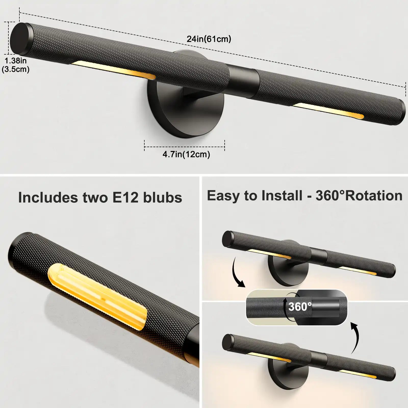 Crafted from solid copper, this sleek black wall sconce adds a touch of industrial charm to any bathroom. Its 360° rotatable shade lets you point the warm 3000K light exactly where you need it, while the built‑in dimmer lets the mood shift with a twist. At 19 inches long and 4.7 inches wide, the sturdy tube holds two E12 bulbs and fits snugly over mirrors or vanity tops. Weighing just 4.4 lb, it’s easy to install with the included hardware and brings durable, rust‑proof lighting to your space.