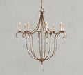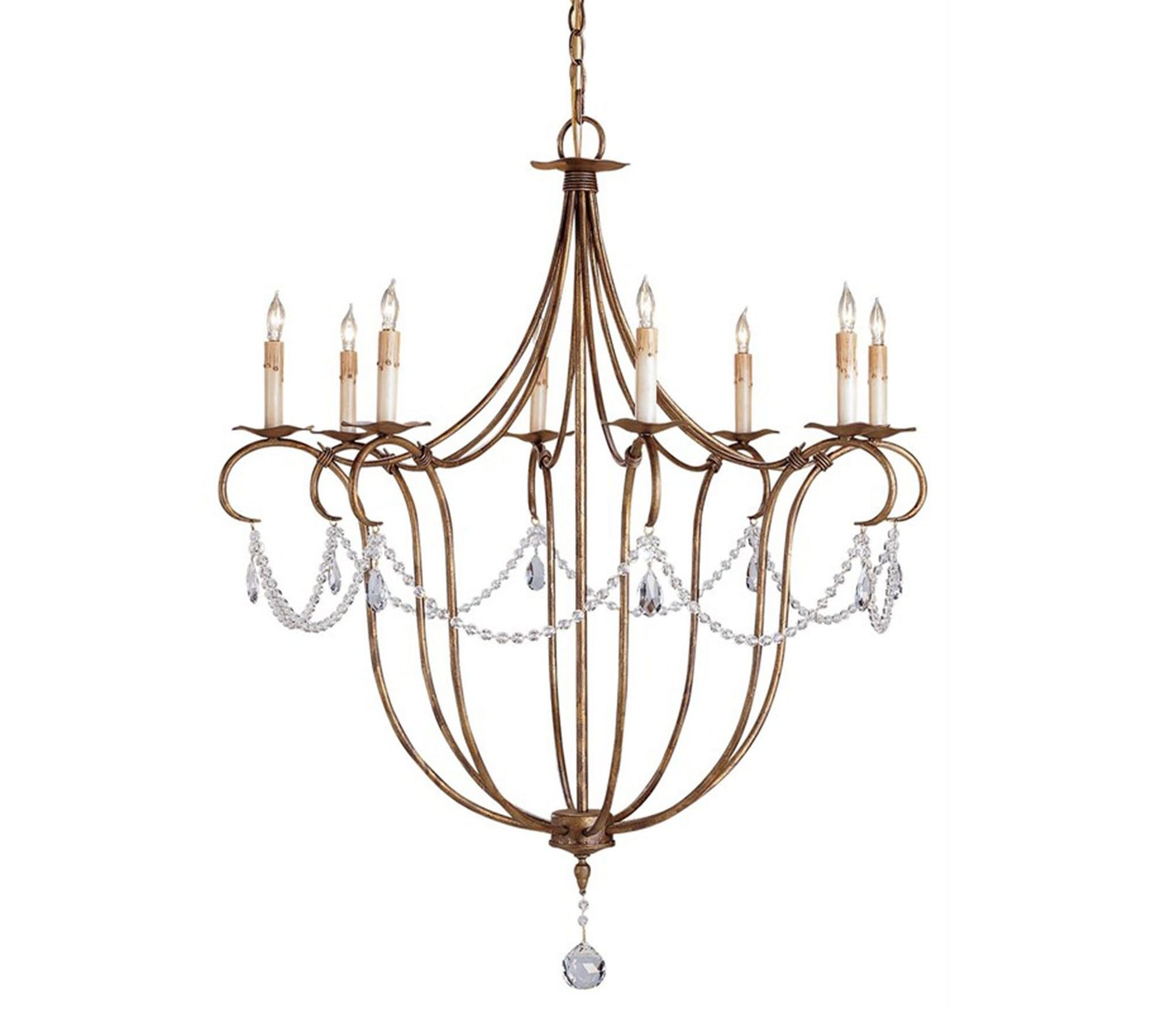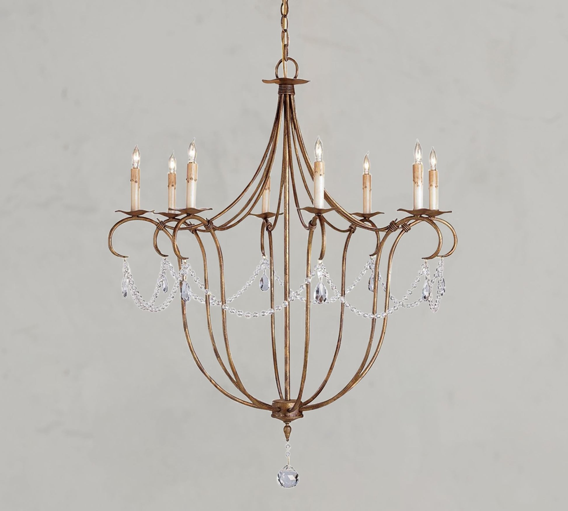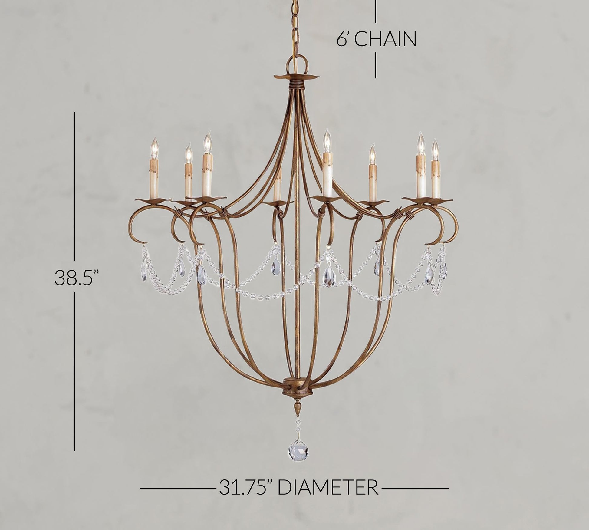 - 1 strand of glass beads encircles fixture; 8 oval crystal drops beneath each bobeche and one prism drop approx 2" diameter at bottom.