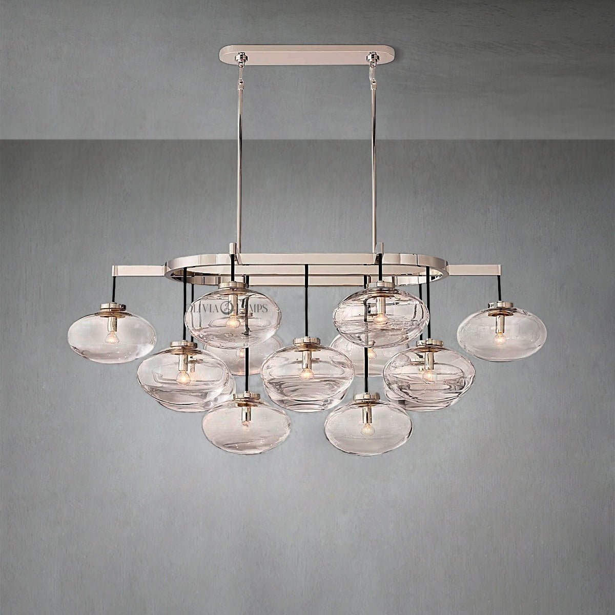 Handblown oval glass shades seem to float overhead in the Cabretle collection by San Francisco, California-based designer Jonathan Browning. Held by an industrial metal frame, the globes are suspended from black cords, marrying clean geometry with understated elegance.