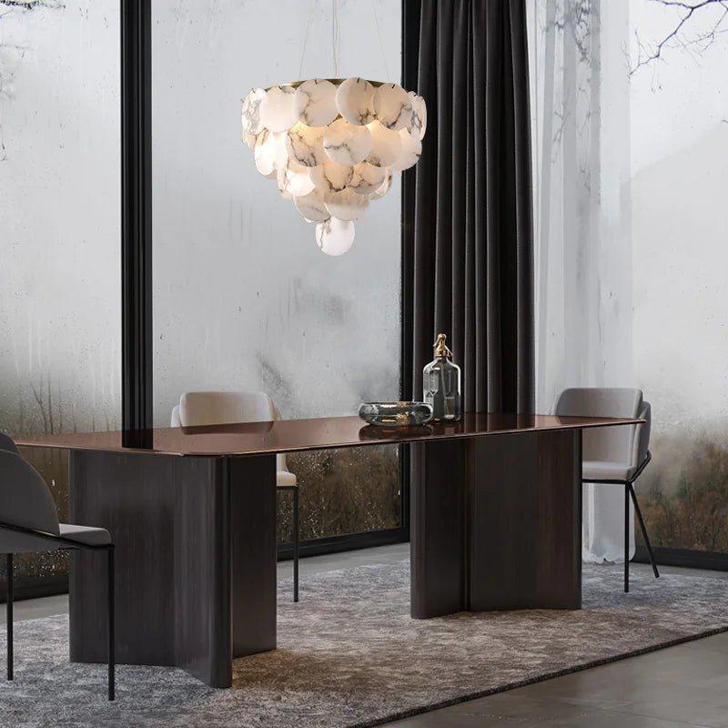 A modern marvel that adds style and functionality to your home. Its design combines a strong metal frame with the beauty of alabaster to create a warm and inviting glow in your living and dining areas.