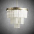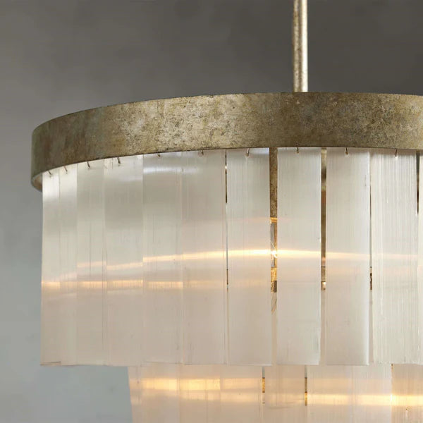 - Adorned with natural selenite crystals, our Cameron Lighting Collection reflects light as they hang elegantly beneath the iron frame. An antiqued silver finish is hand-brushed by our artisans, creating a glamorous aesthetic.