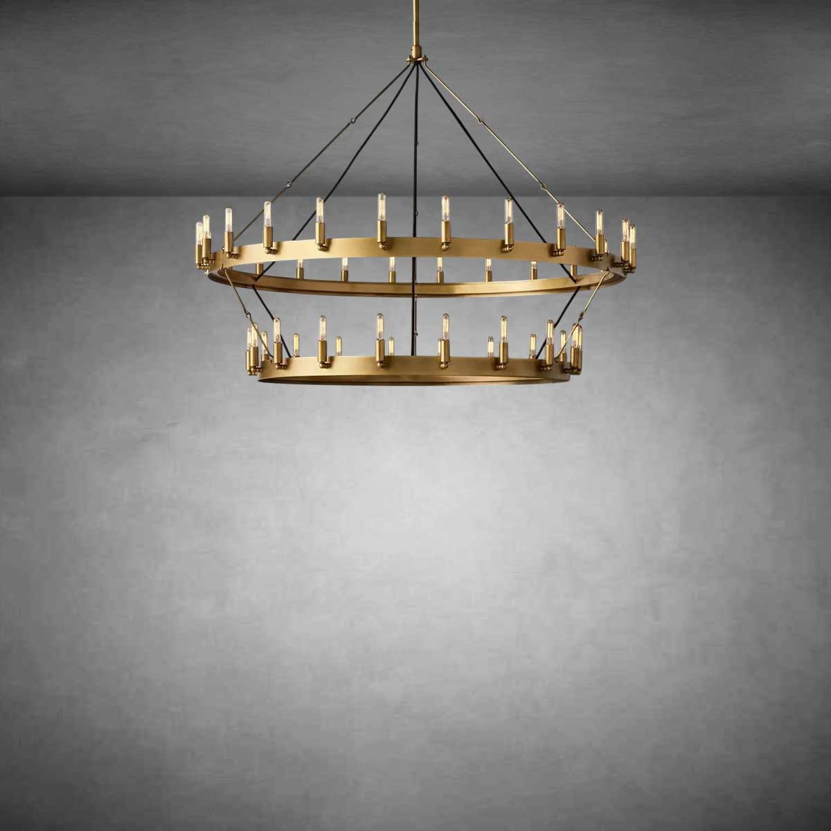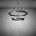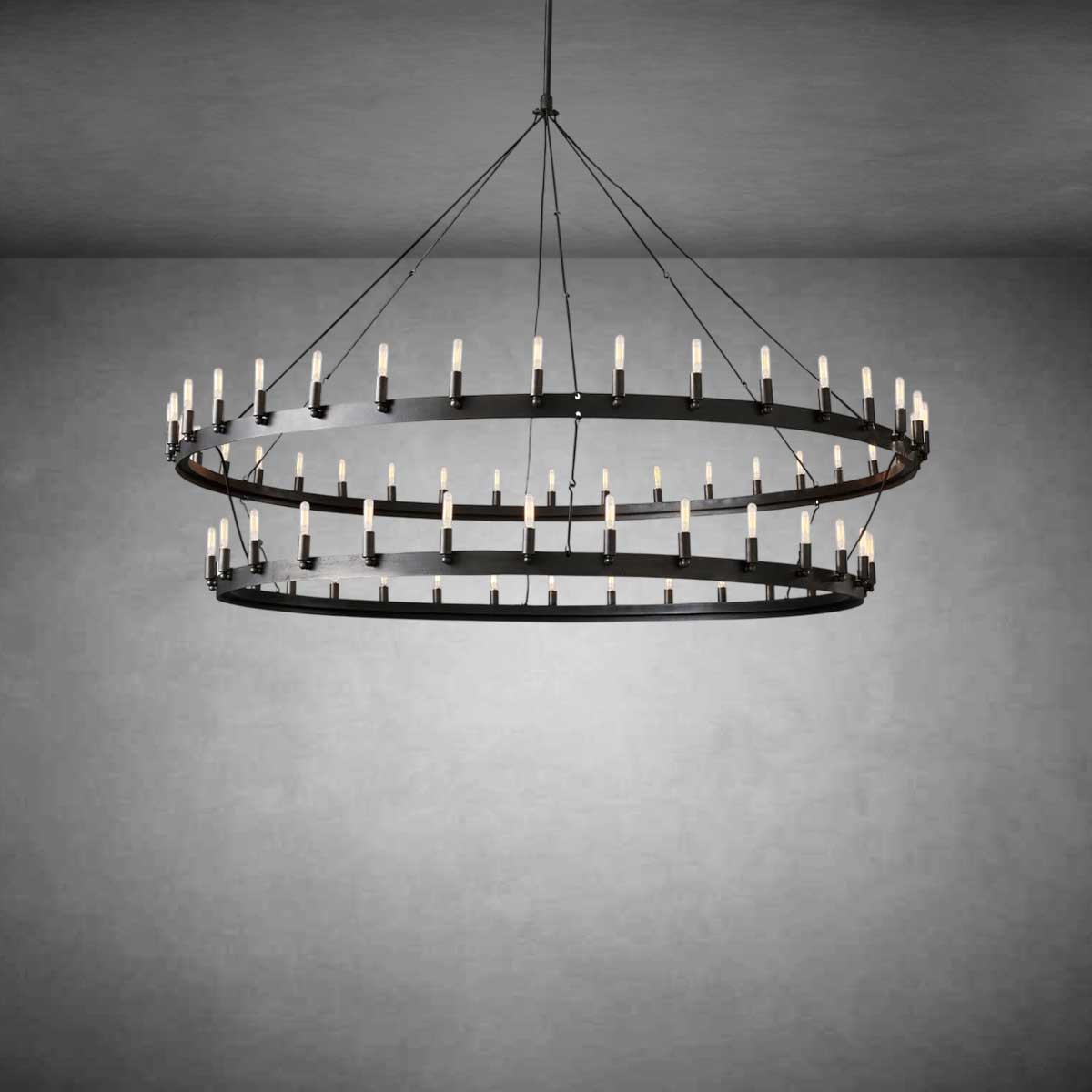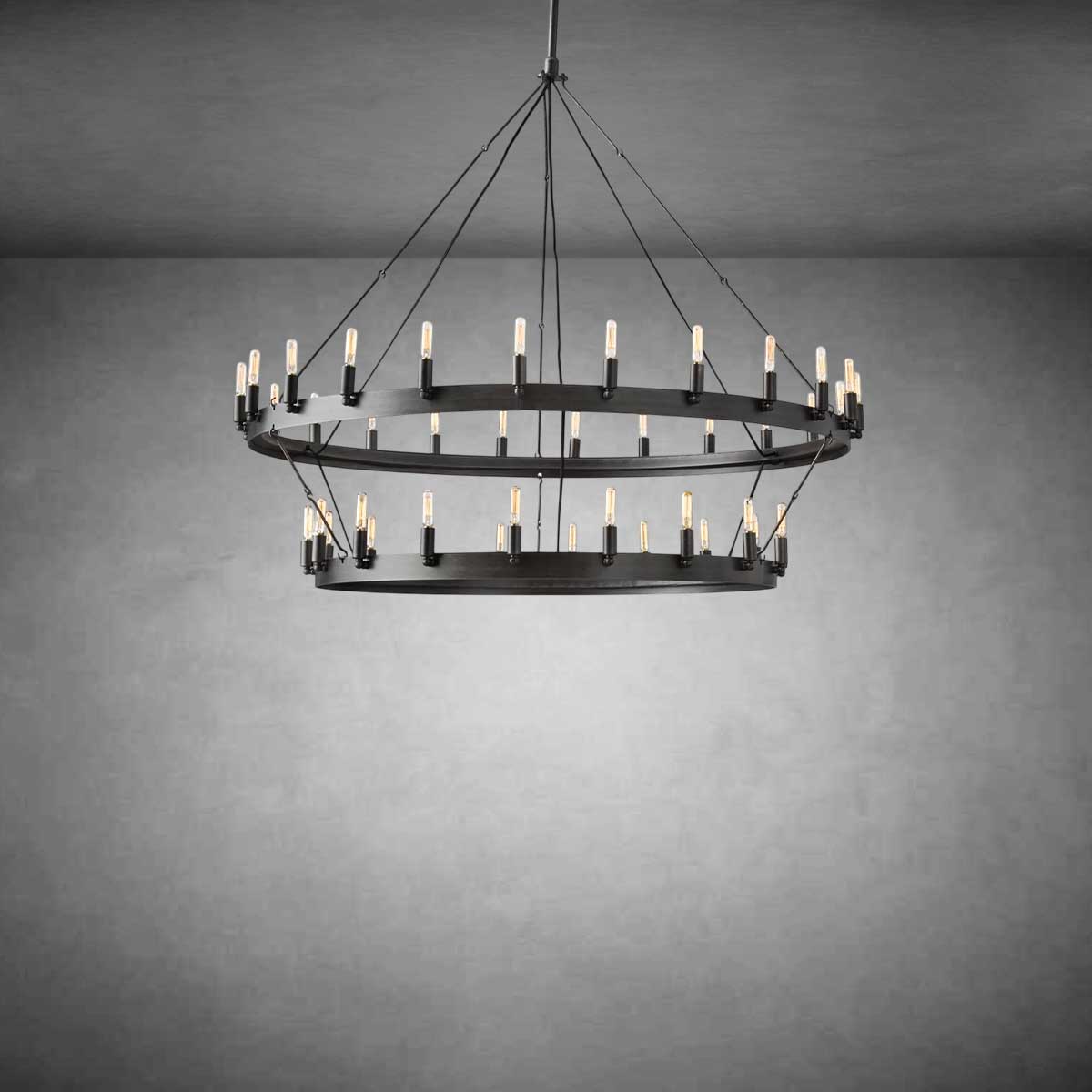 Hand-forged angle-iron rings frame two graceful tiers of raised bulbs, creating a sculptural modern presence. Sheet-metal socket wraps and a textured cast ceiling plate add refined industrial character.
