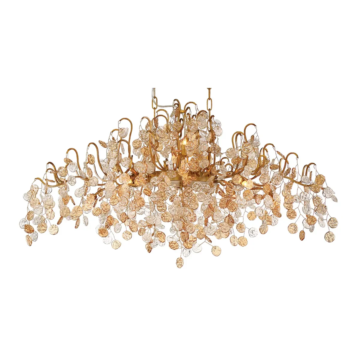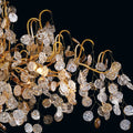 The Campo Collection features an intricate gold metal wire frame adorned with delicately hand-strung glass wafers. This stunning fixture combines artistic design with exquisite craftsmanship, creating a captivating centerpiece that illuminates spaces with elegance and charm.Product Details