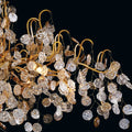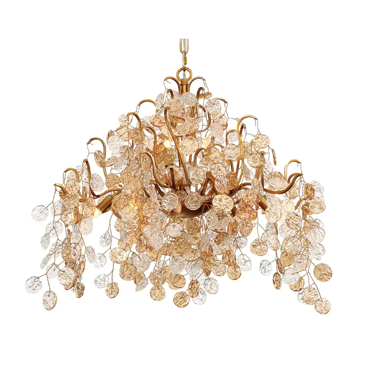 The Campo Collection features an intricate gold metal wire frame adorned with delicately hand-strung glass wafers. This stunning fixture combines artistic design with exquisite craftsmanship, creating a captivating centerpiece that illuminates spaces with elegance and charm.