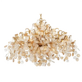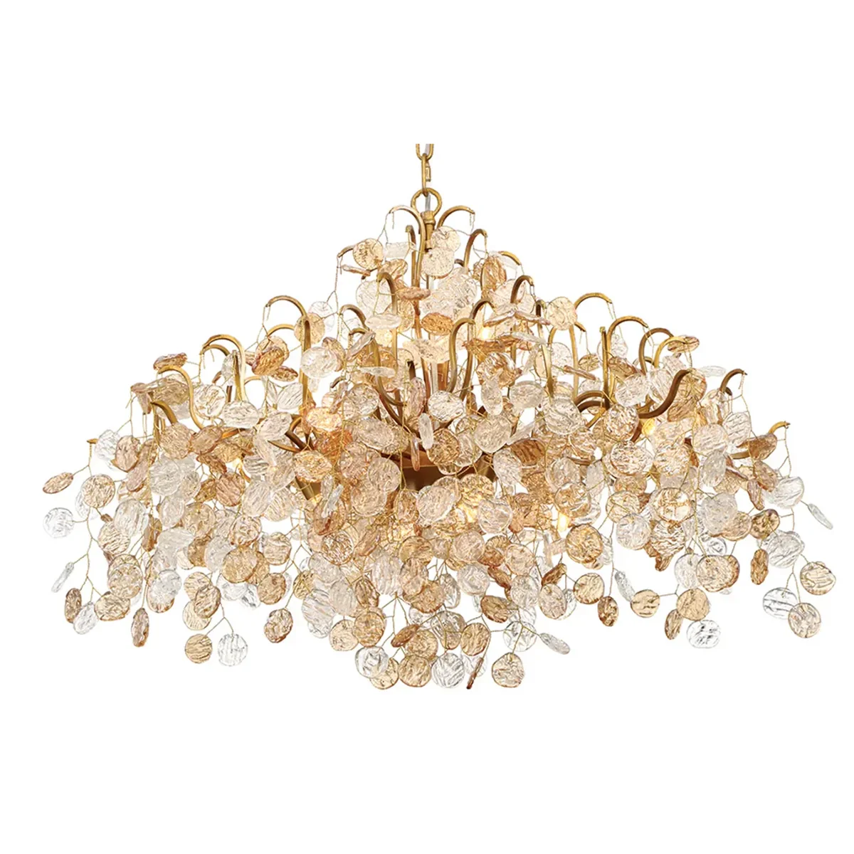 The Campo Collection features an intricate gold metal wire frame adorned with delicately hand-strung glass wafers. This stunning fixture combines artistic design with exquisite craftsmanship, creating a captivating centerpiece that illuminates spaces with elegance and charm.
