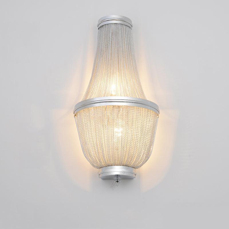 | Unlike traditional wall sconce this two light wall light from 19Th C. French empire chainmail has unique dark grey rows of chain cascading downwards creating dramatic effect. It will sure add edgy focal point to any interior spaces. |