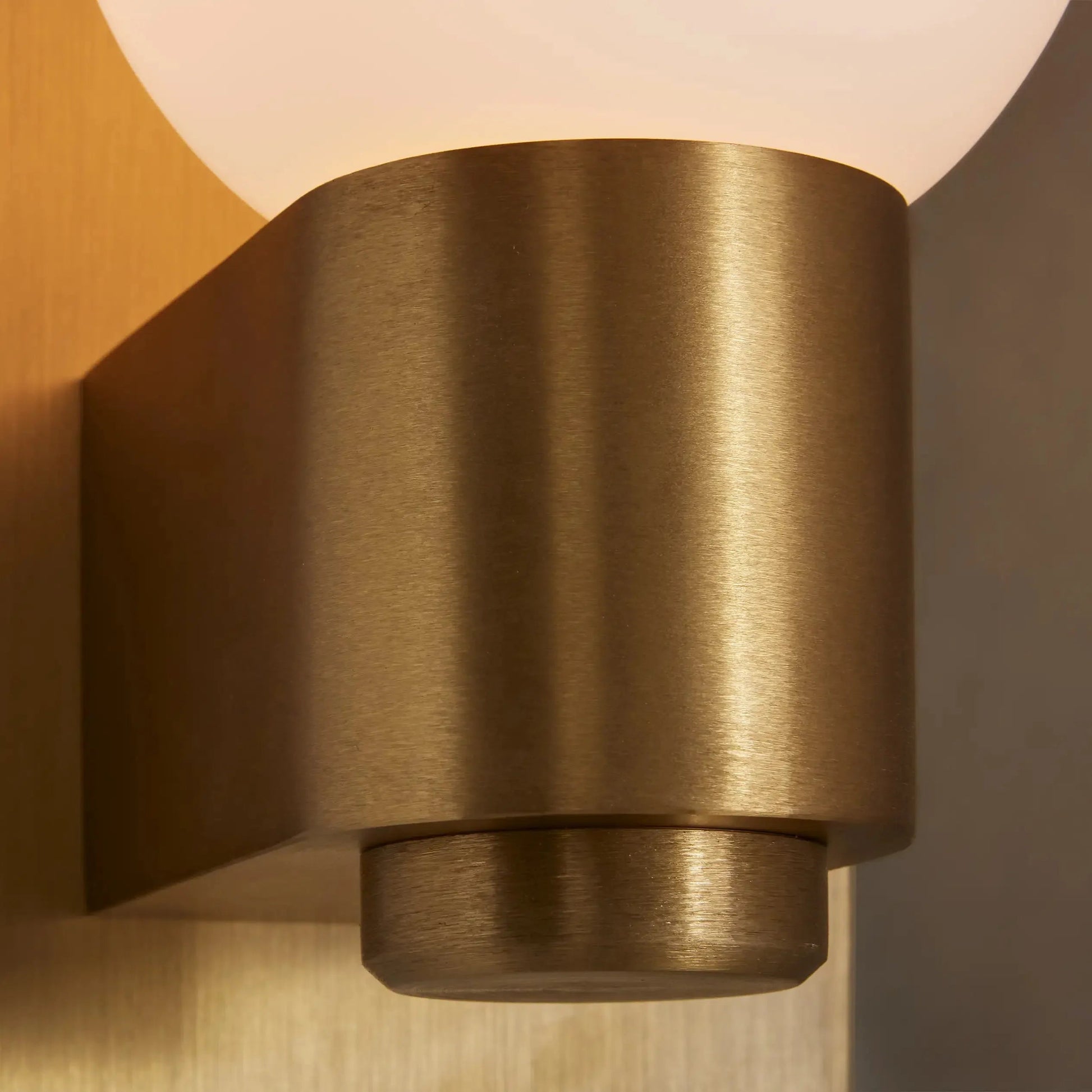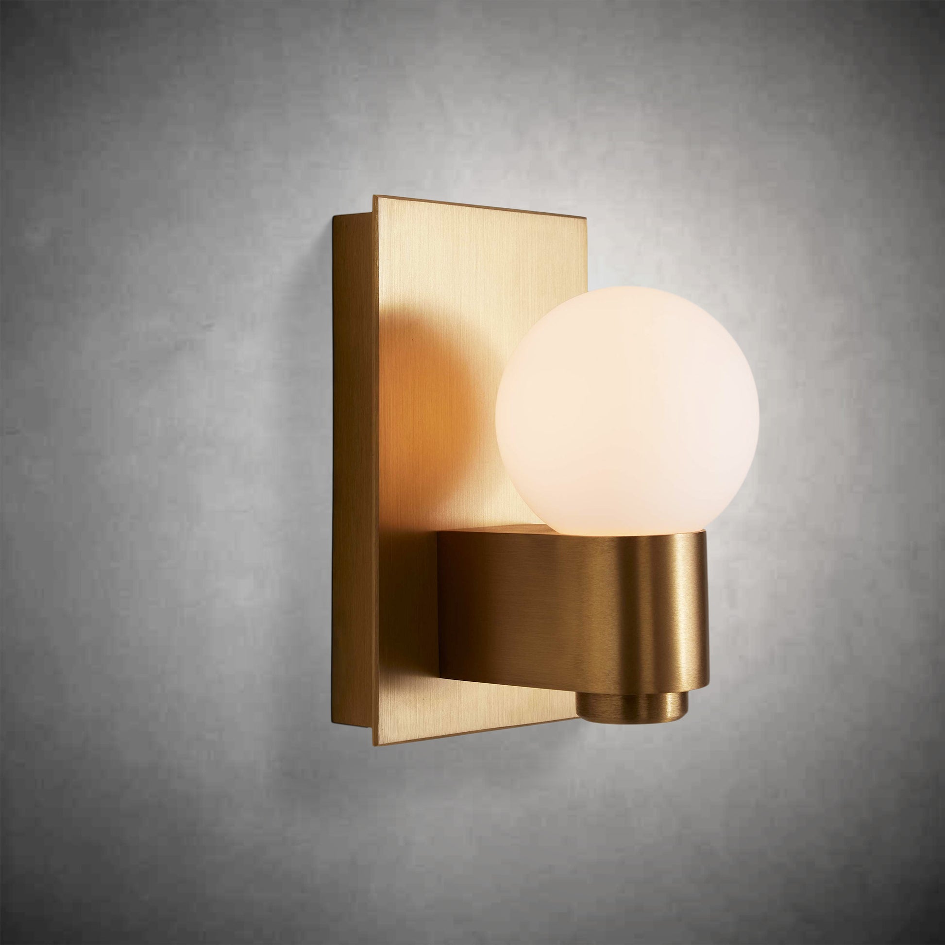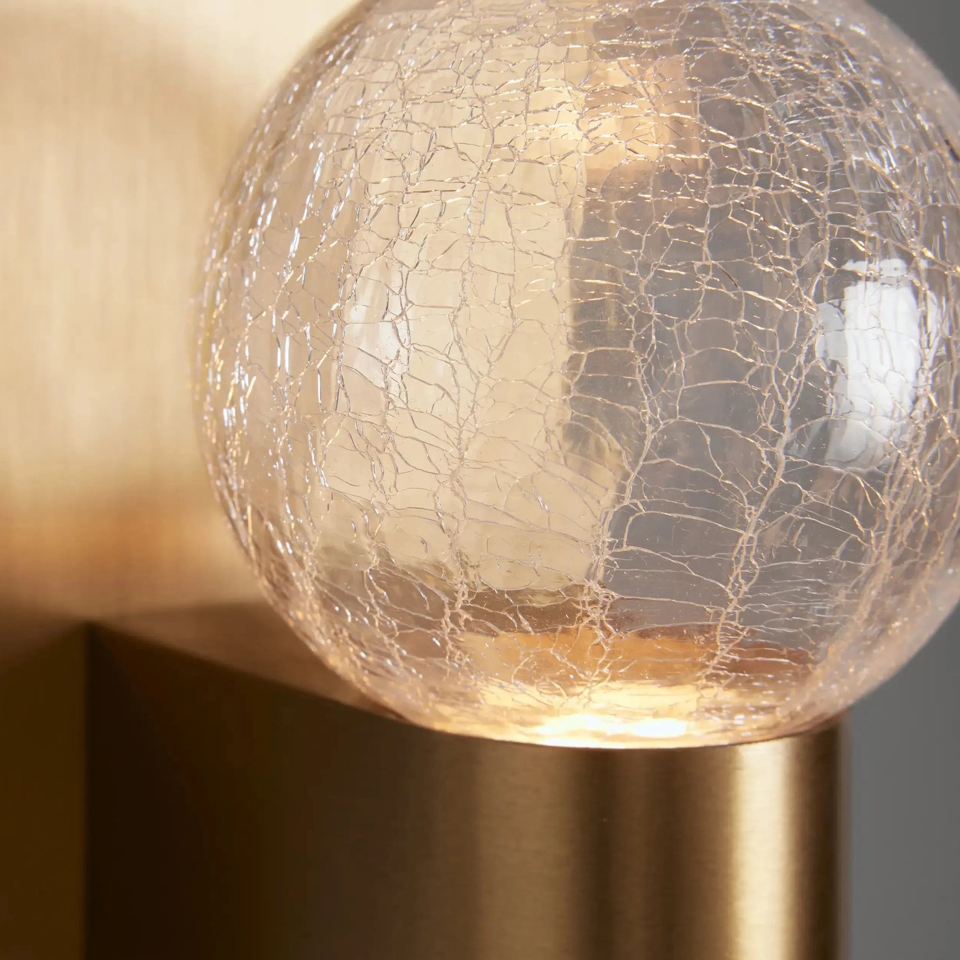 - Crafted from stainless steel with a satin brass finish and a mouth blown solid opal glass globe or crackle glass globe.