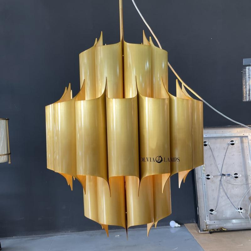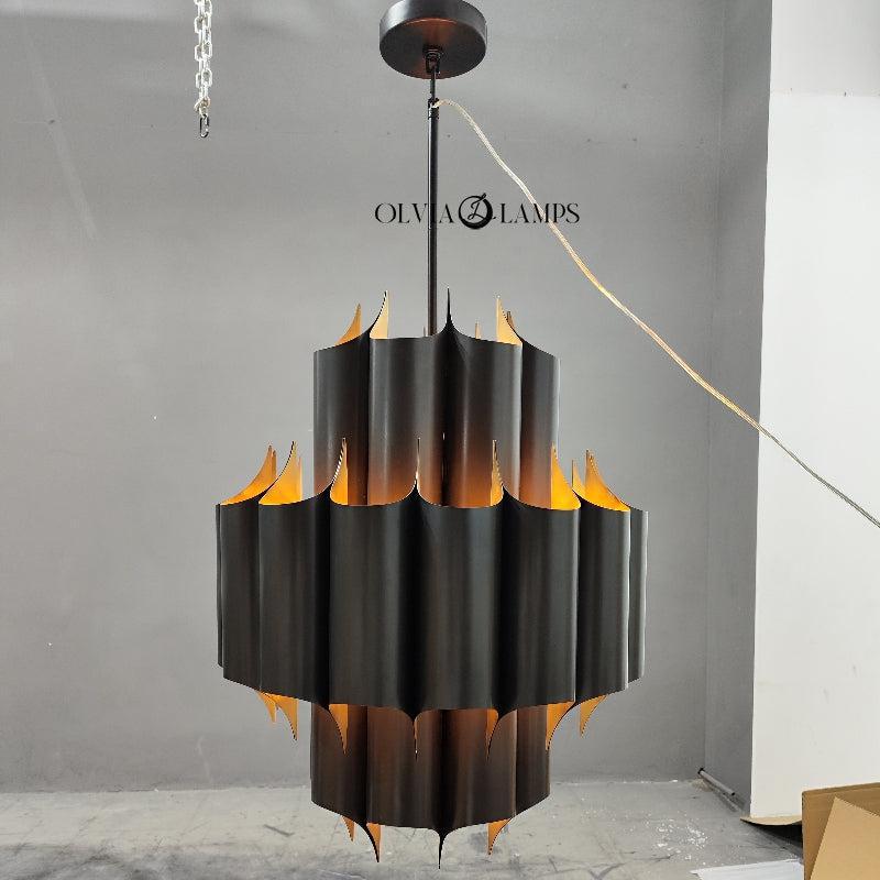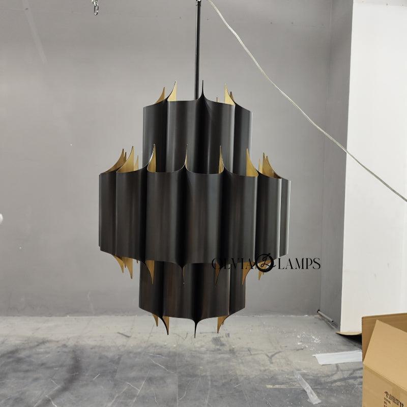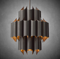 | The series of lights consists of undulating pieces of copper. An iconic mid-century design, this sculptural fixture transforms the traditional concept of the chandelier into a modern art object. |
