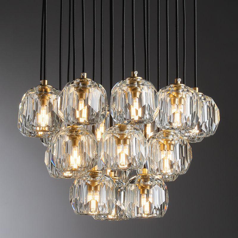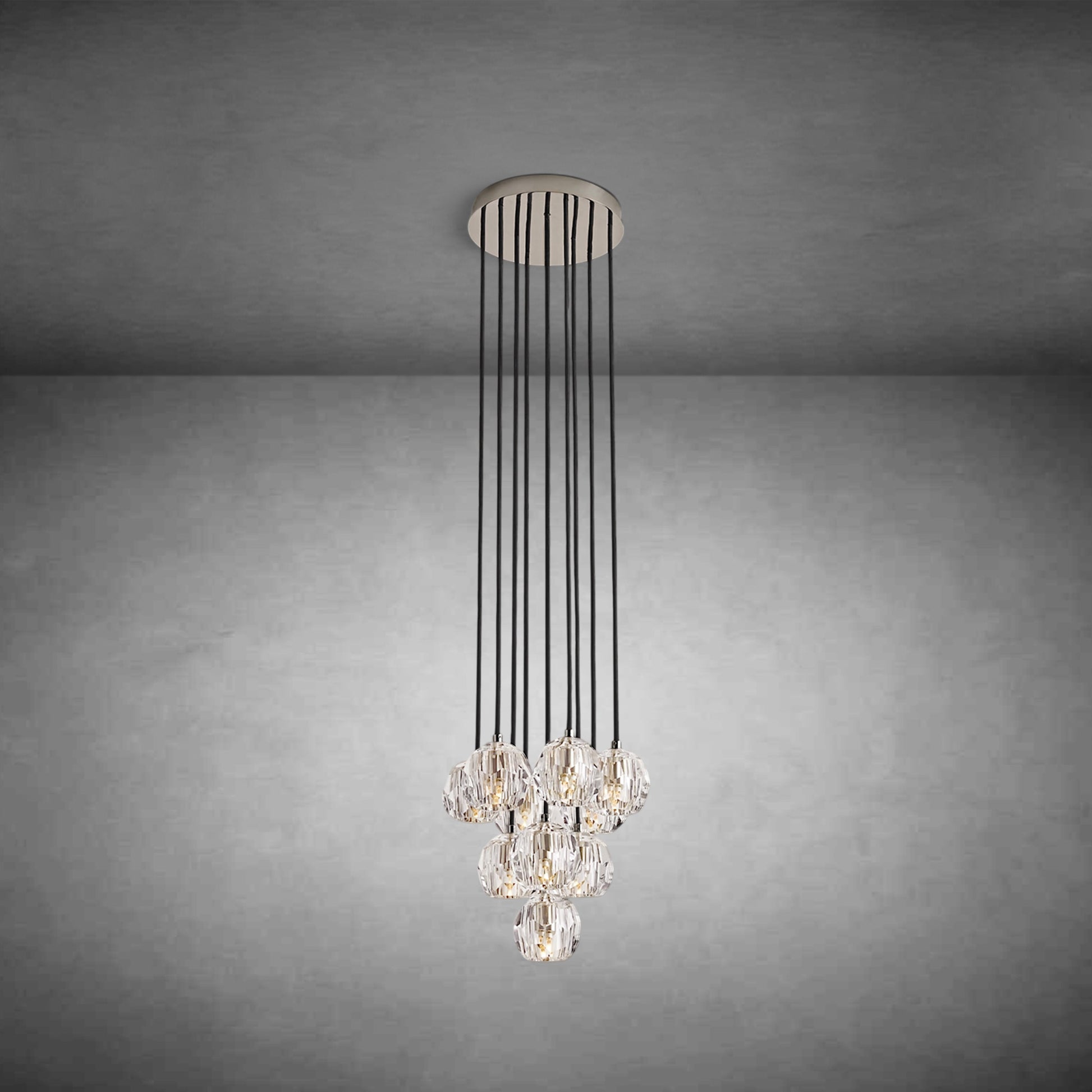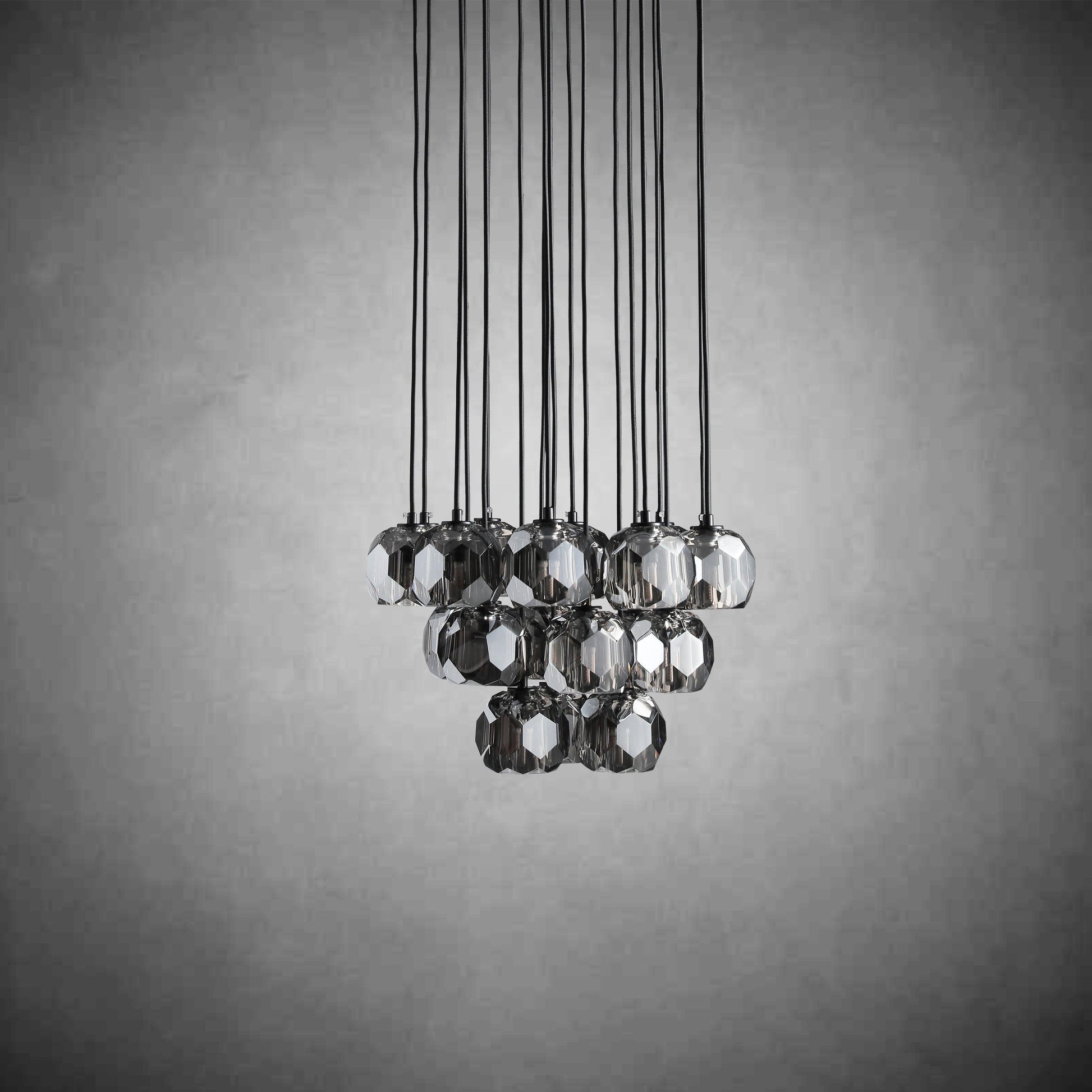 | Crafted of solid brass and crystal glass, the sculptural fixture is a testament to our passion for luxe materials and superior craftsmanship. Evoking the minimalist spirit of 1960s design, each finely faceted sphere is ground and polished by hand to reflect and refract the light. |