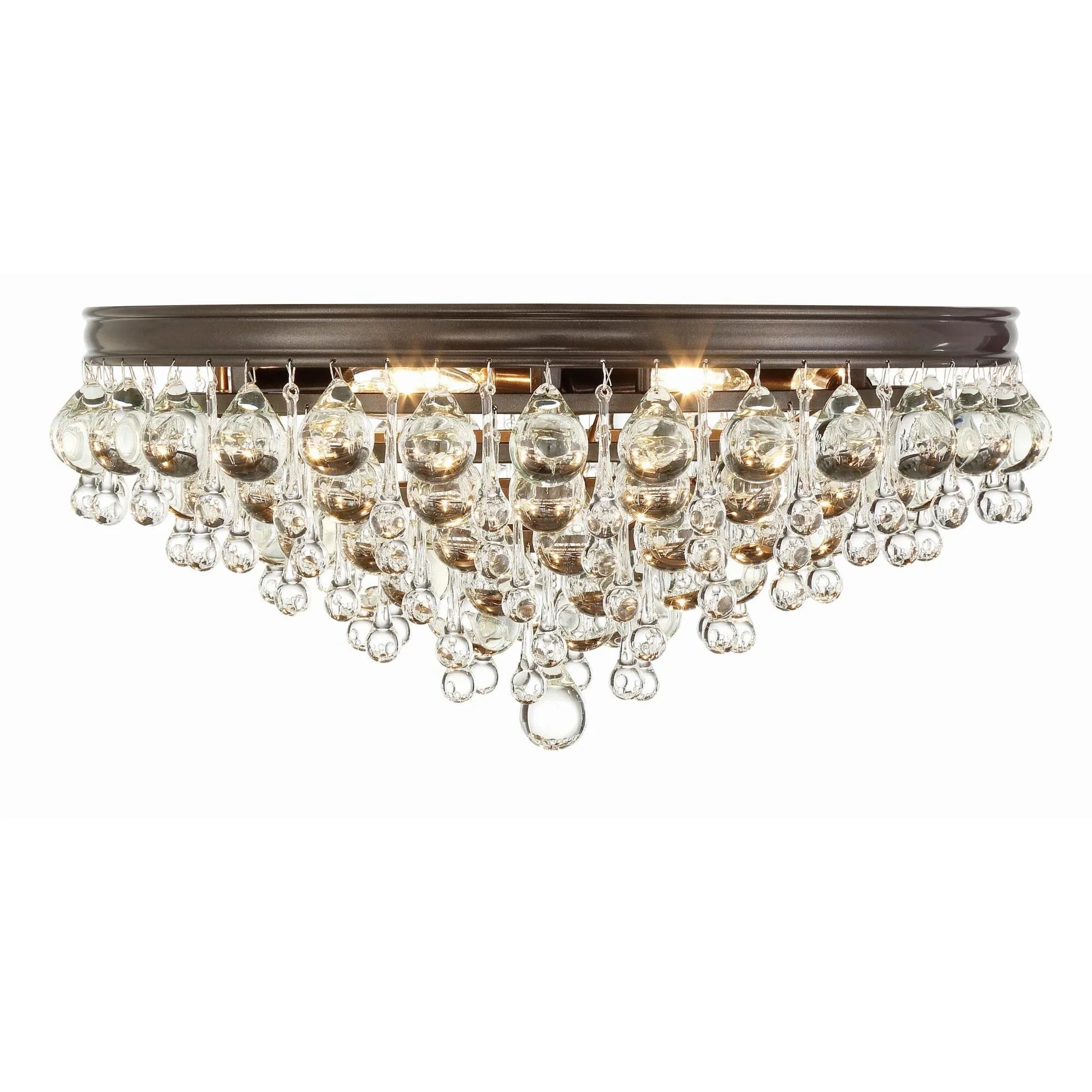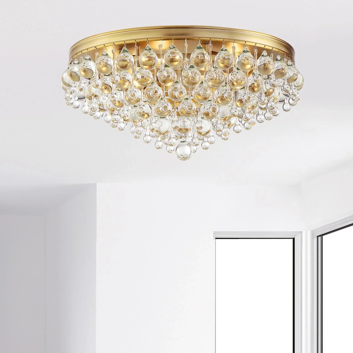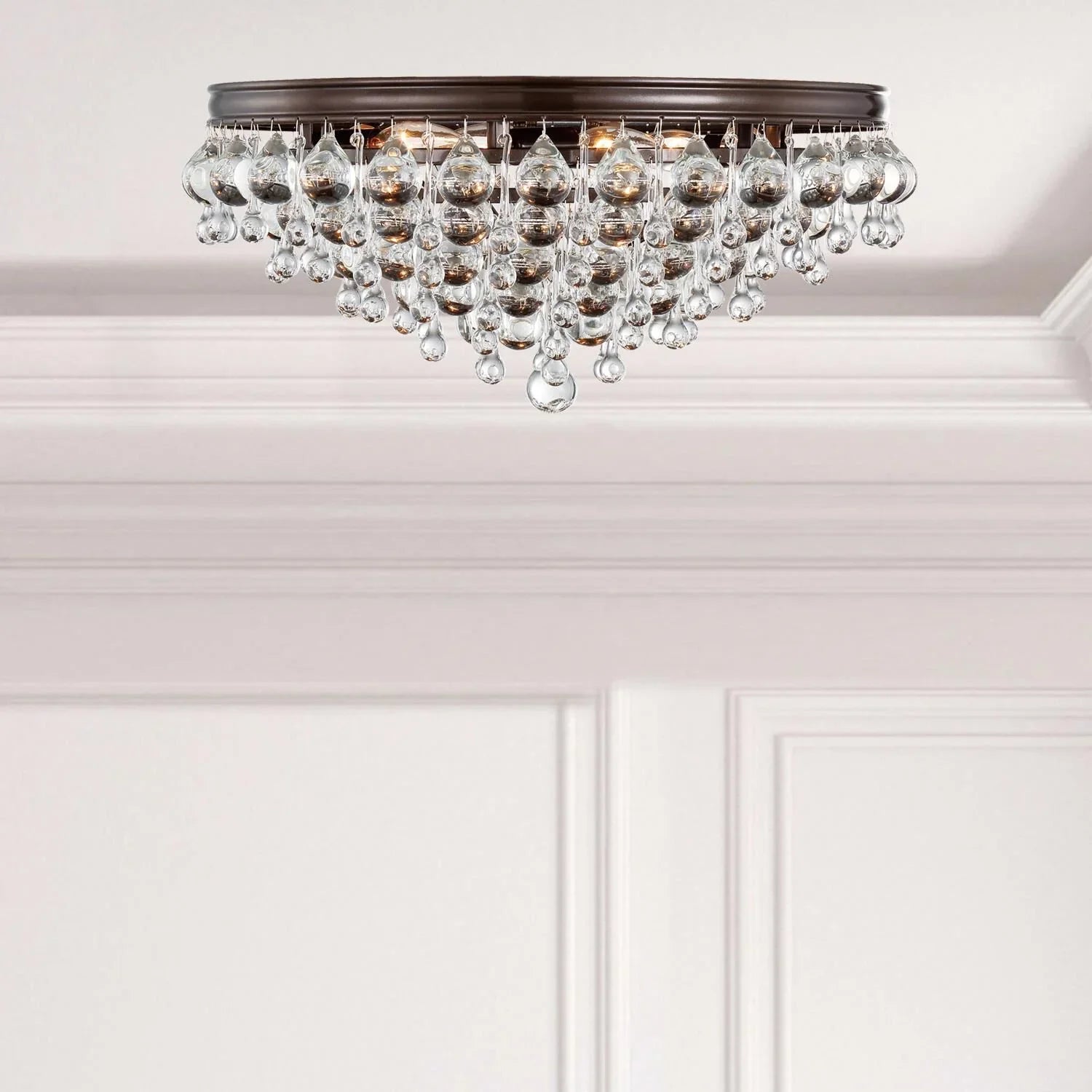 Elegance and glamour will illuminate the room with the Calypso collection. Draped in an abundance of smoothed shaped clear drops and balls, this contemporary flush mount is a perfect statement. Elevate your living room, dining room, bathroom, or entry with this stunning fixture. It features a sleek design and sparkling crystal accents.