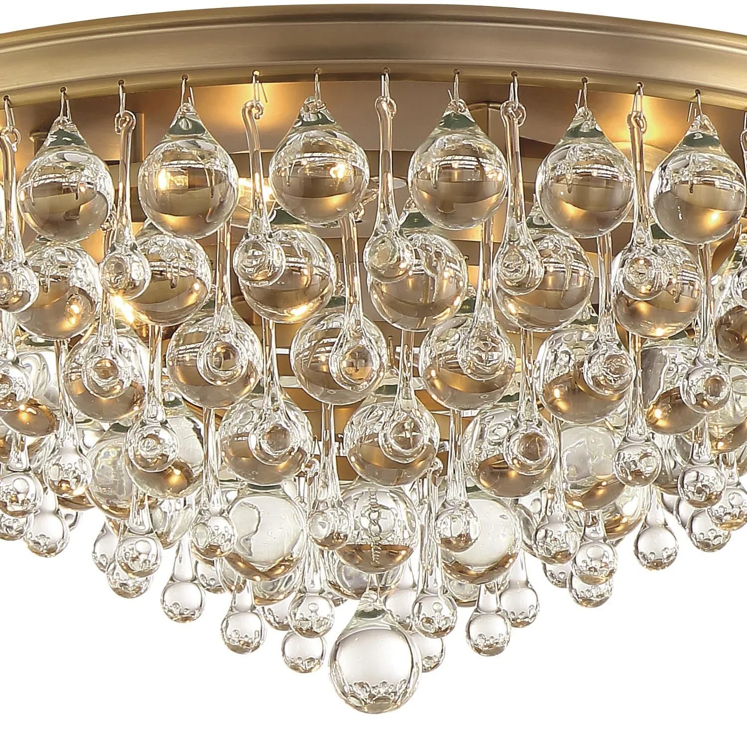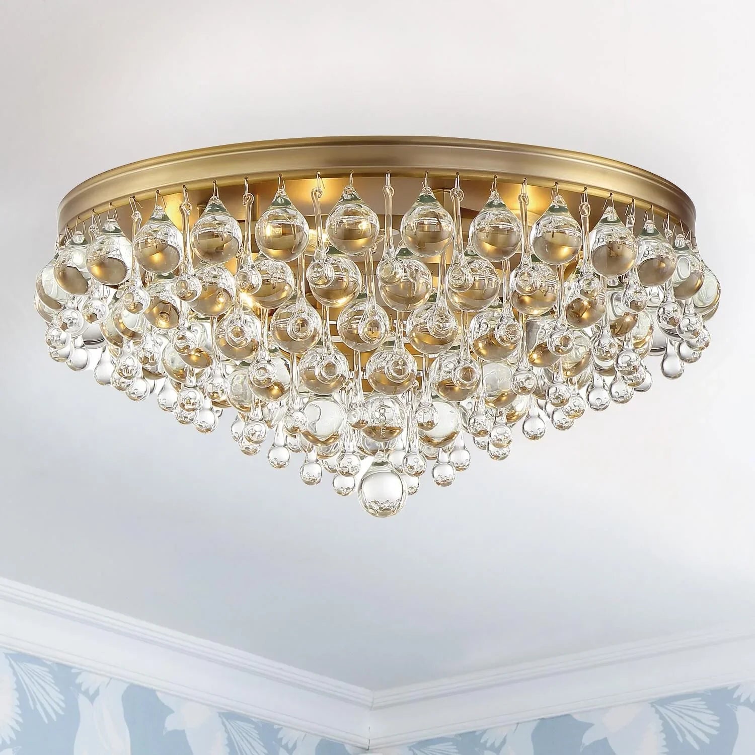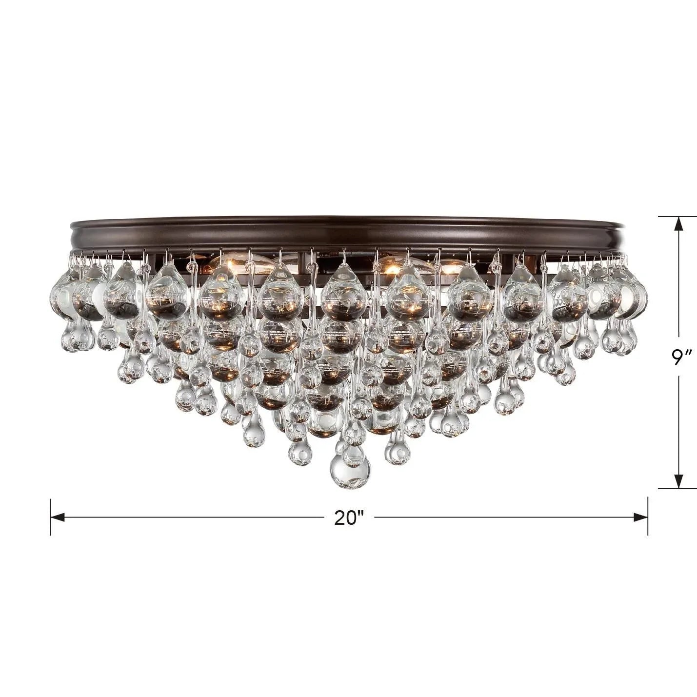 Elegance and glamour will illuminate the room with the Calypso collection. Draped in an abundance of smoothed shaped clear drops and balls, this contemporary flush mount is a perfect statement. Elevate your living room, dining room, bathroom, or entry with this stunning fixture. It features a sleek design and sparkling crystal accents.