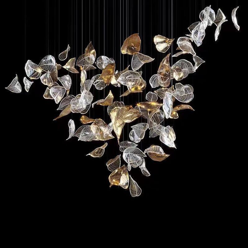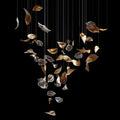 Transform your space with our customizable Leaf Chandelier. Crafted with anodized gold aluminum, it emits a warm upward glow and stunning shadow play. The integrated LED lights showcase its brushed gold finish, bringing a touch of nature indoors. Experience the beauty of a sun-dappled forest with its narrow spotlights.