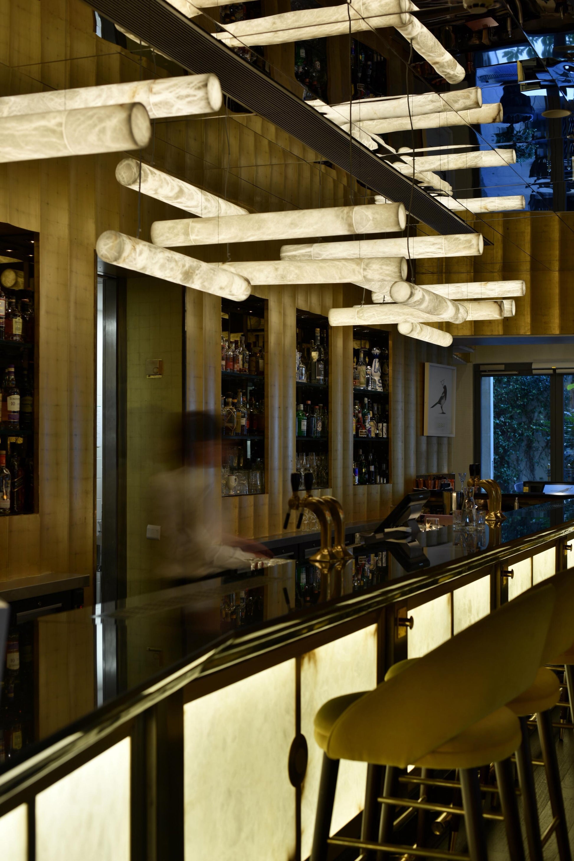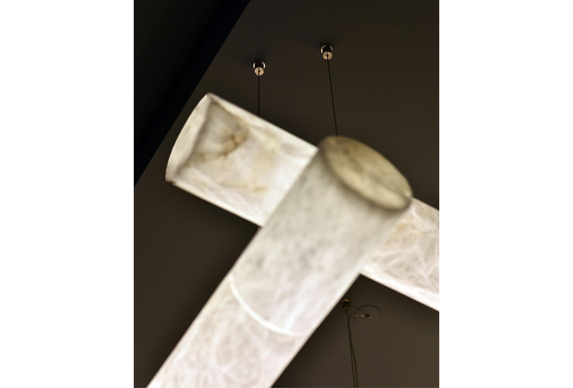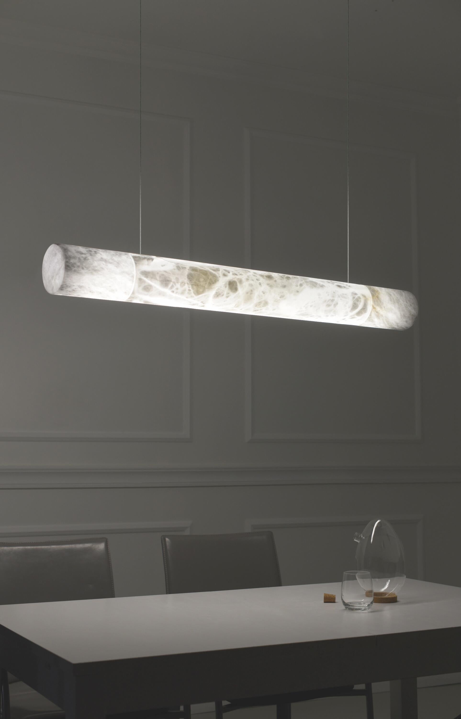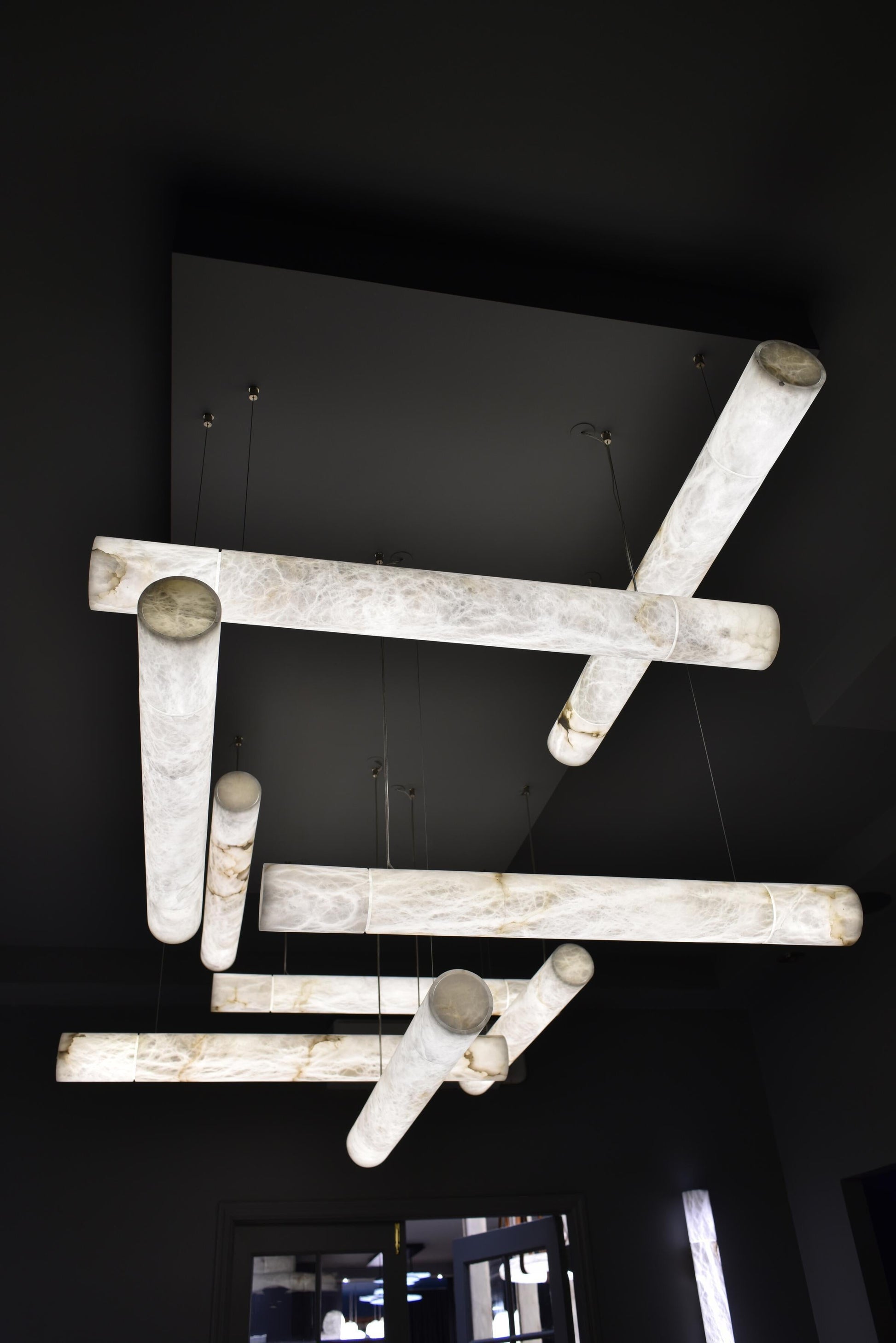The multiplication of models for this simple cylindrical alabaster linear Chandeliers creates structured lighting compositions.The concept is an opus of alabaster cylinders also coming in wall lights and vertical Chandeliers.