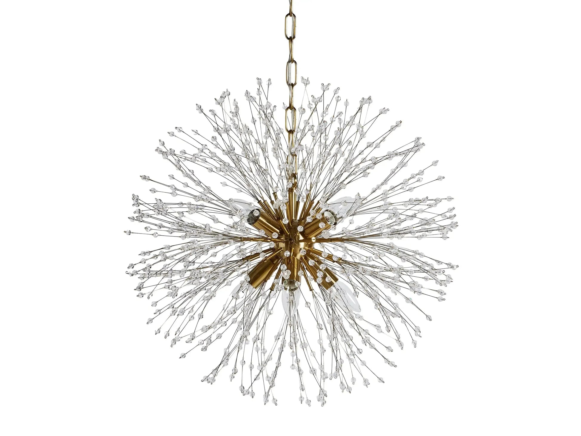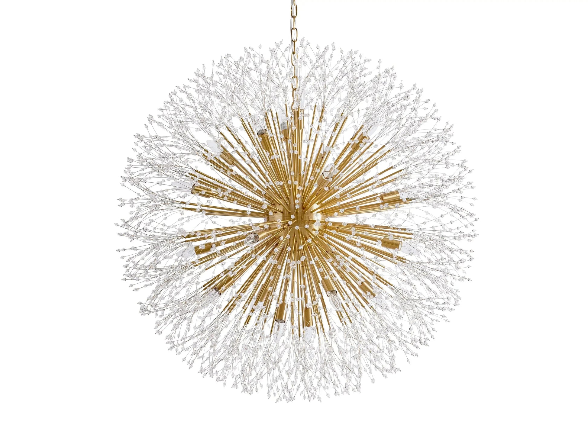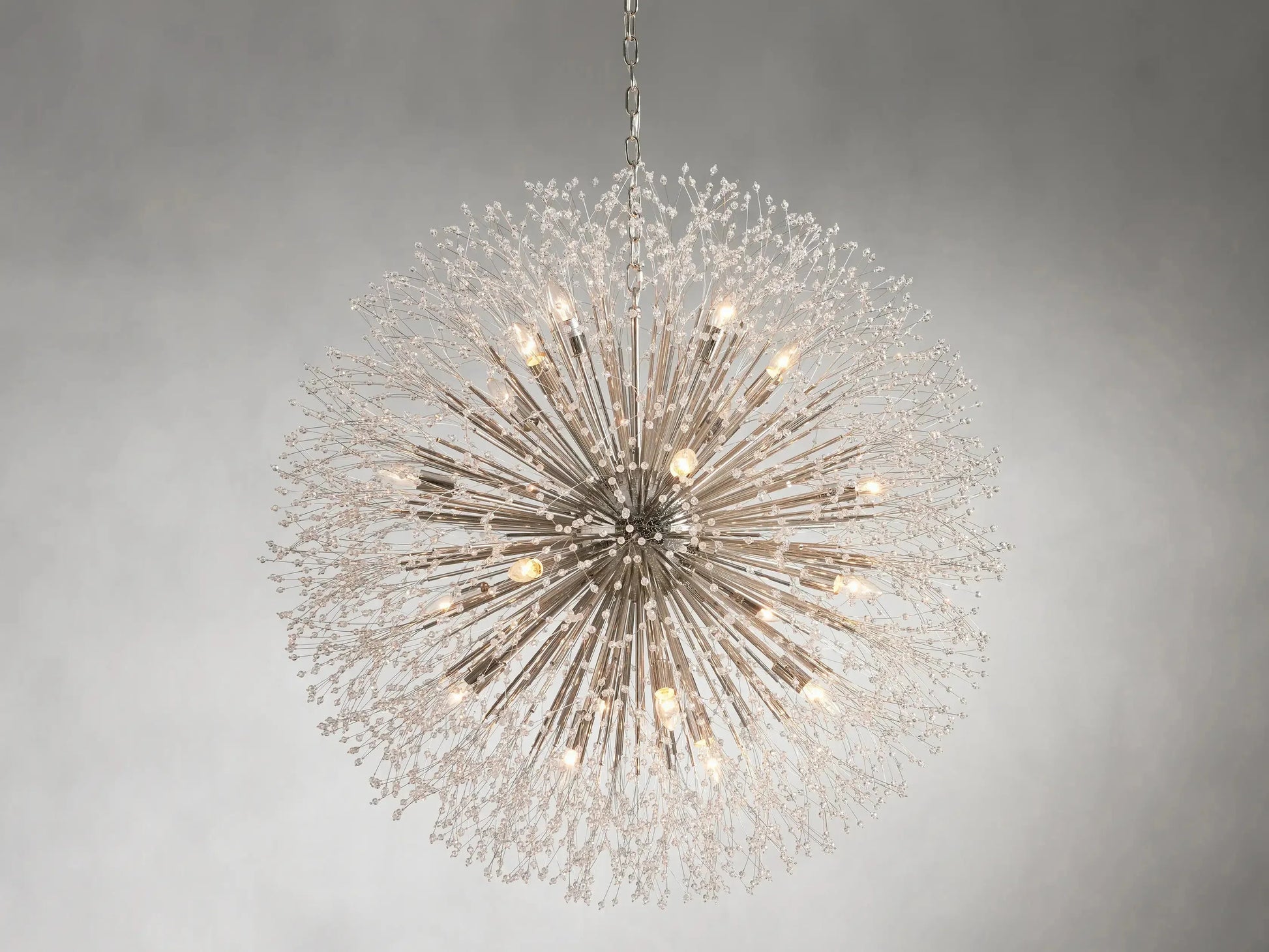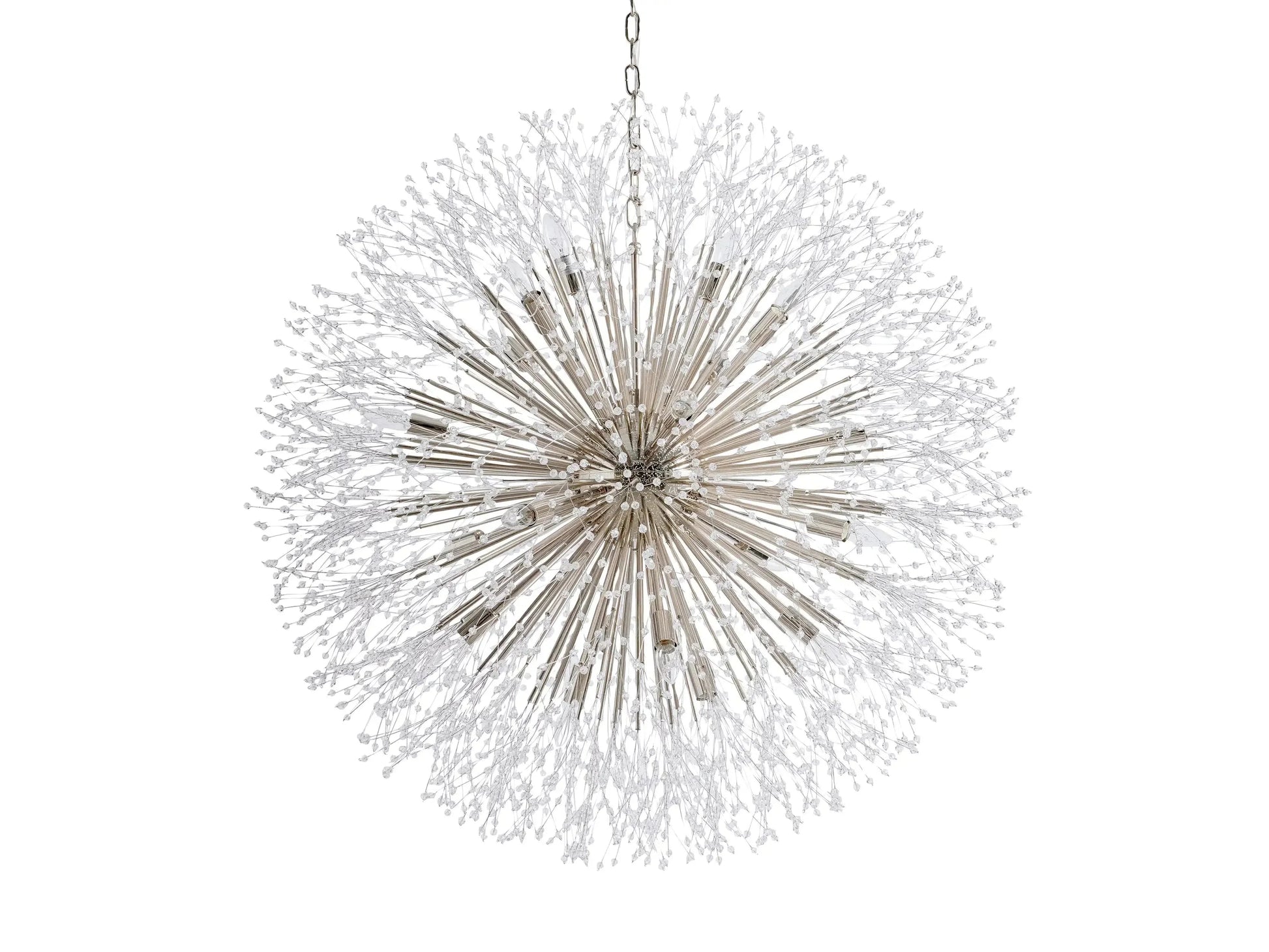 - Delightfully designed to resemble a dandelion after it’s blossomed, our elegant Dandelion Chandelier beautifully twinkles with reflected light. Crafted from nickel-plated iron with a painted finish, Dandelion’s radiating crystals will add whimsical wonder to any space.