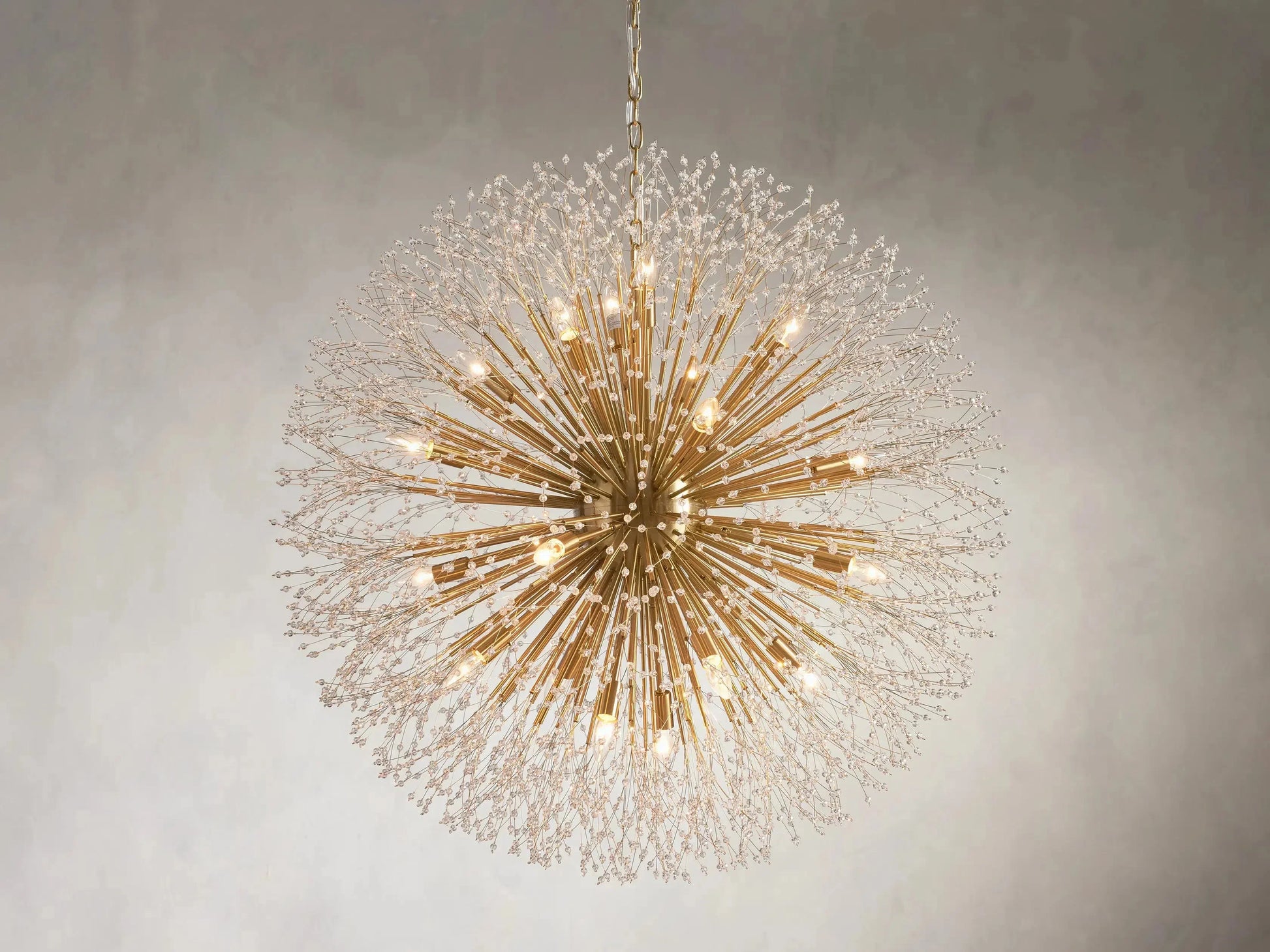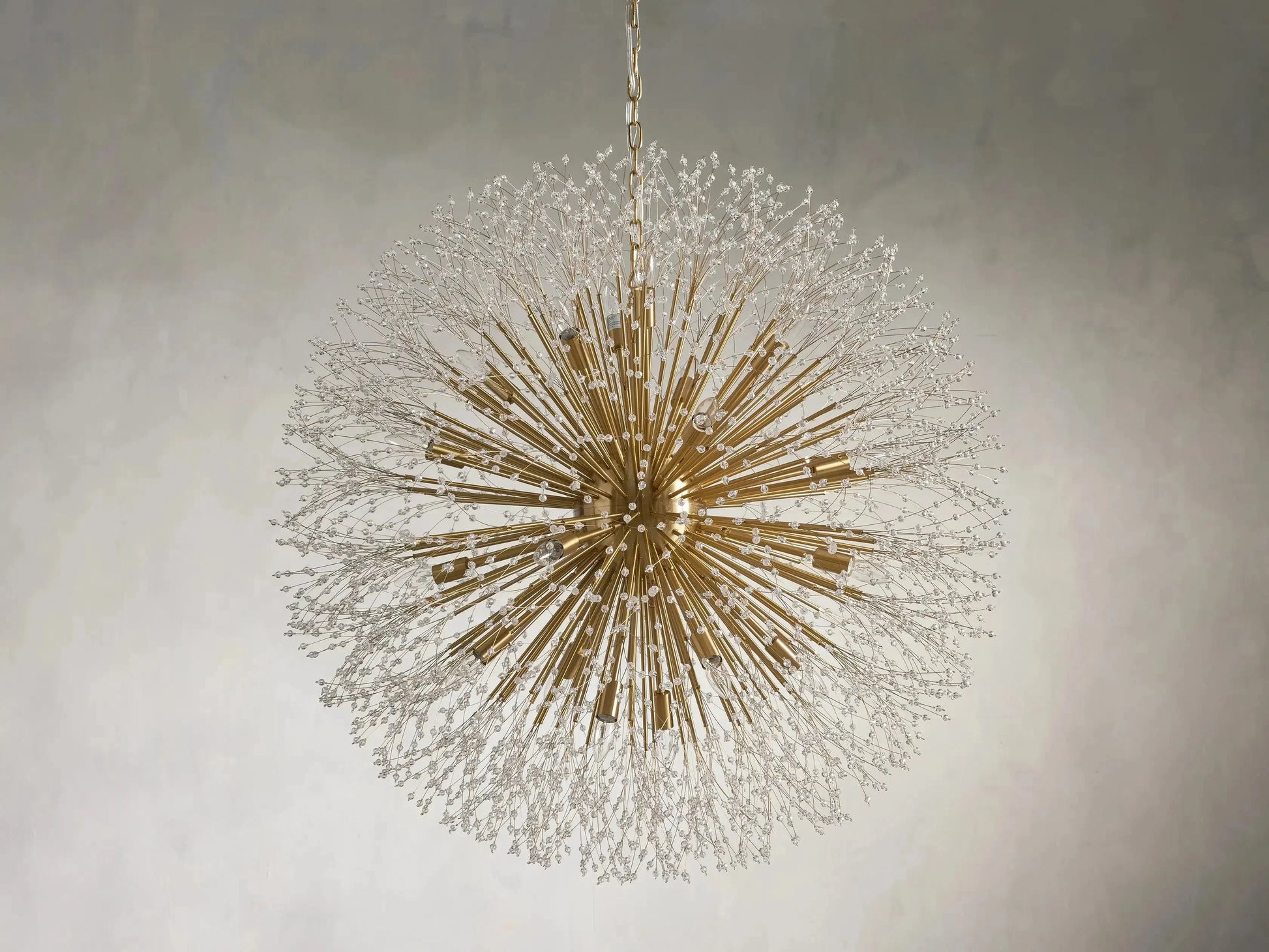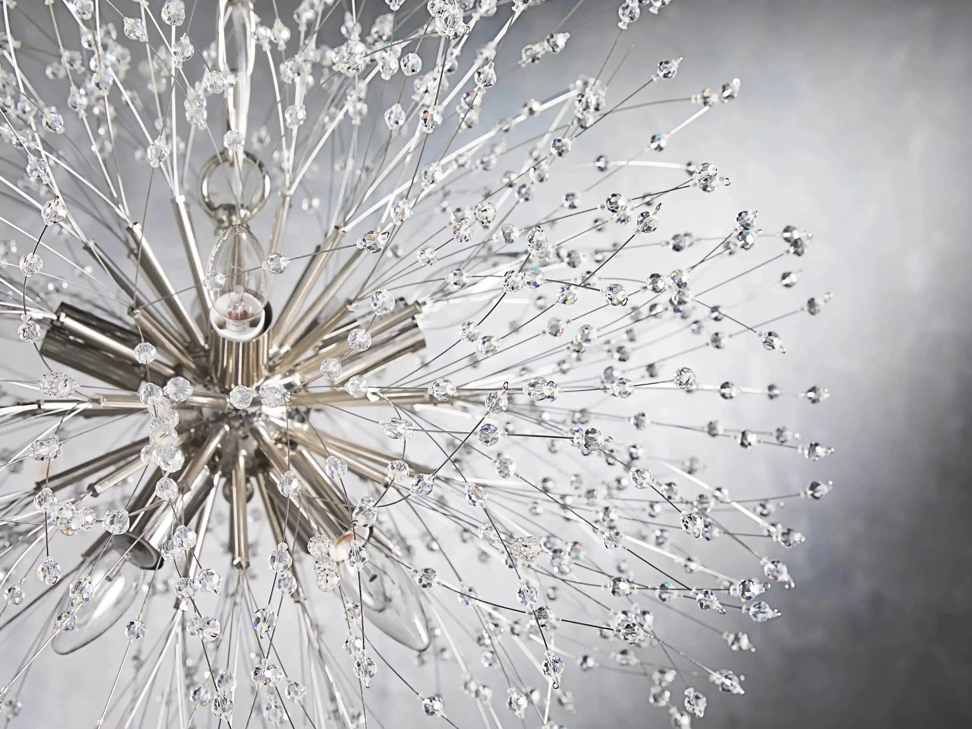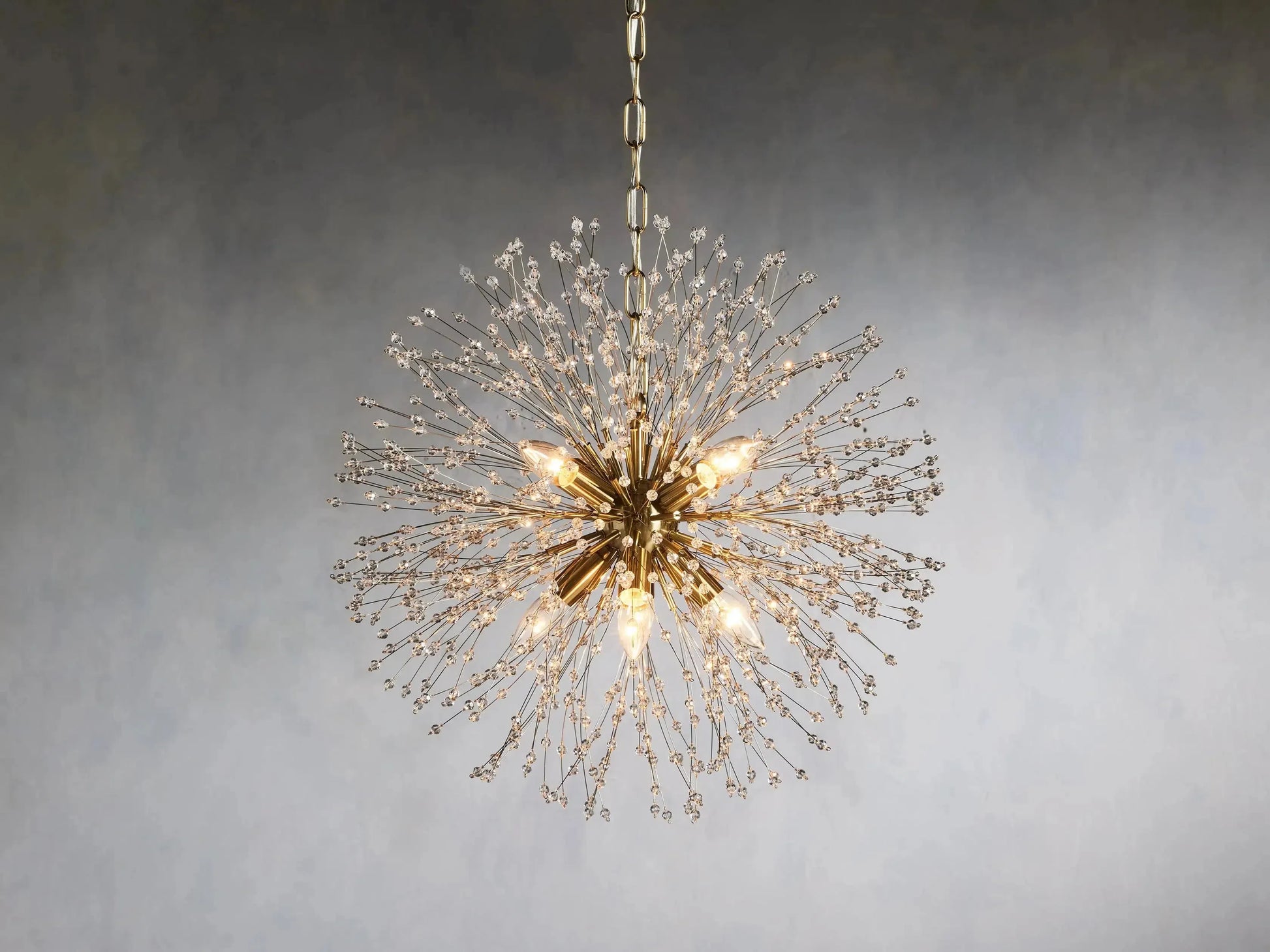 - Delightfully designed to resemble a dandelion after it’s blossomed, our elegant Dandelion Chandelier beautifully twinkles with reflected light. Crafted from nickel-plated iron with a painted finish, Dandelion’s radiating crystals will add whimsical wonder to any space.