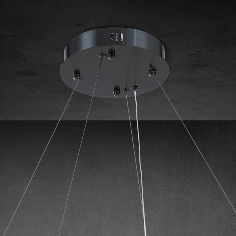 | A collection of chandelier with minimal shapes and striking effects, highlighting the beauty of calcite, a translucent stone that radiates a warm, natural glow. Halos of polished stone are suspended from slender steel cables, artfully stitched together to create a smooth, continuous surface, while subtle lighting inside accentuates the organic colors and textures. Each luminaire is a unique statement. |