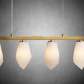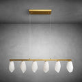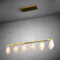 This refined linear alabaster chandelier brings understated luxury to modern interiors. Crafted from natural alabaster and warm brass, the elongated silhouette creates a clean architectural statement while softly diffusing light through the stone’s organic veining.
