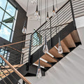 Besides the general rule that the chandelier’s bottom should be at least 7 and a half feet away from the floor. For two stories, what you also need to consider is how will it look from the second floor. In general, staircase chandeliers will be a good choice for space. In term of placing, below are two commonly seen guidance: