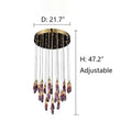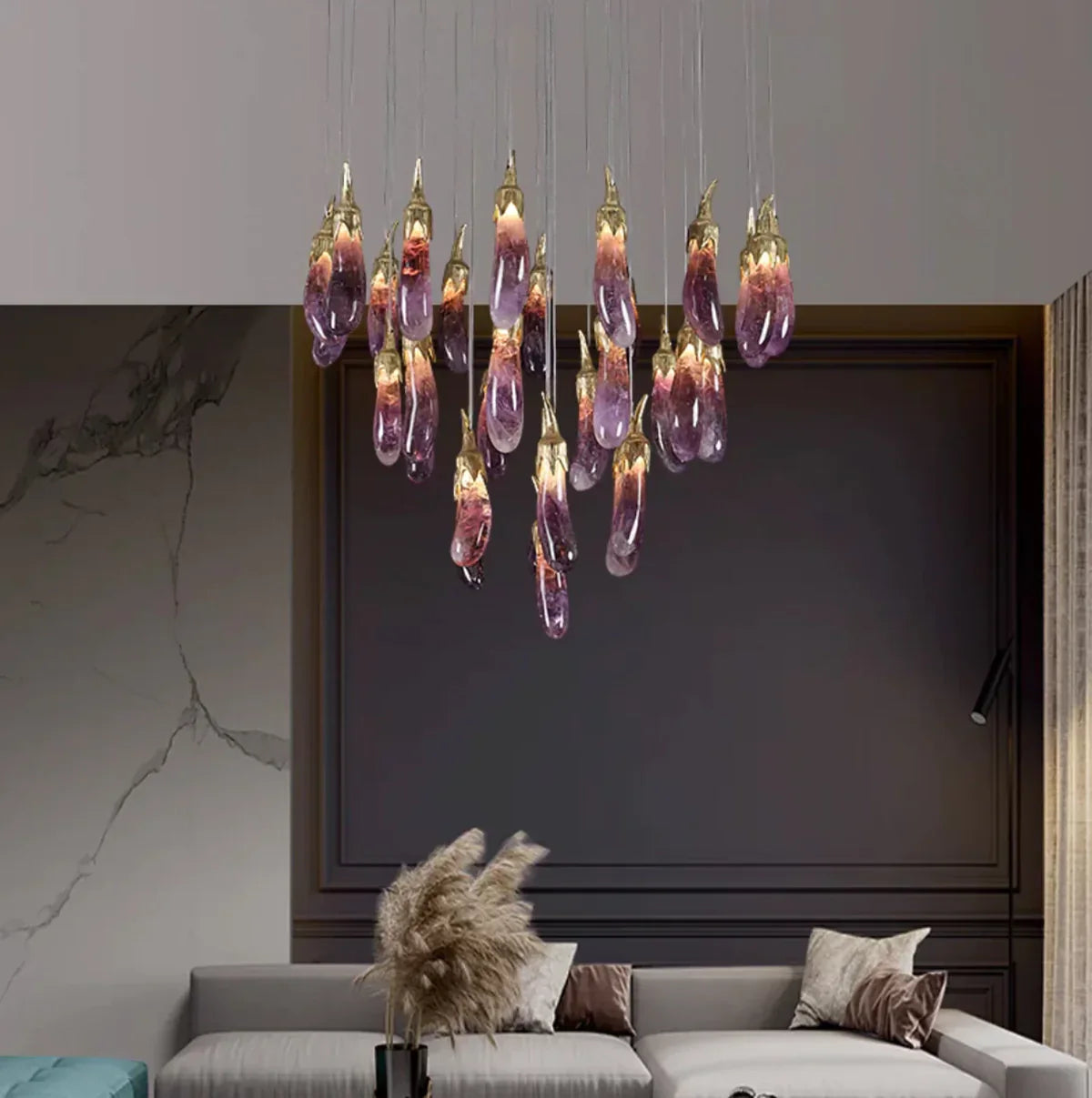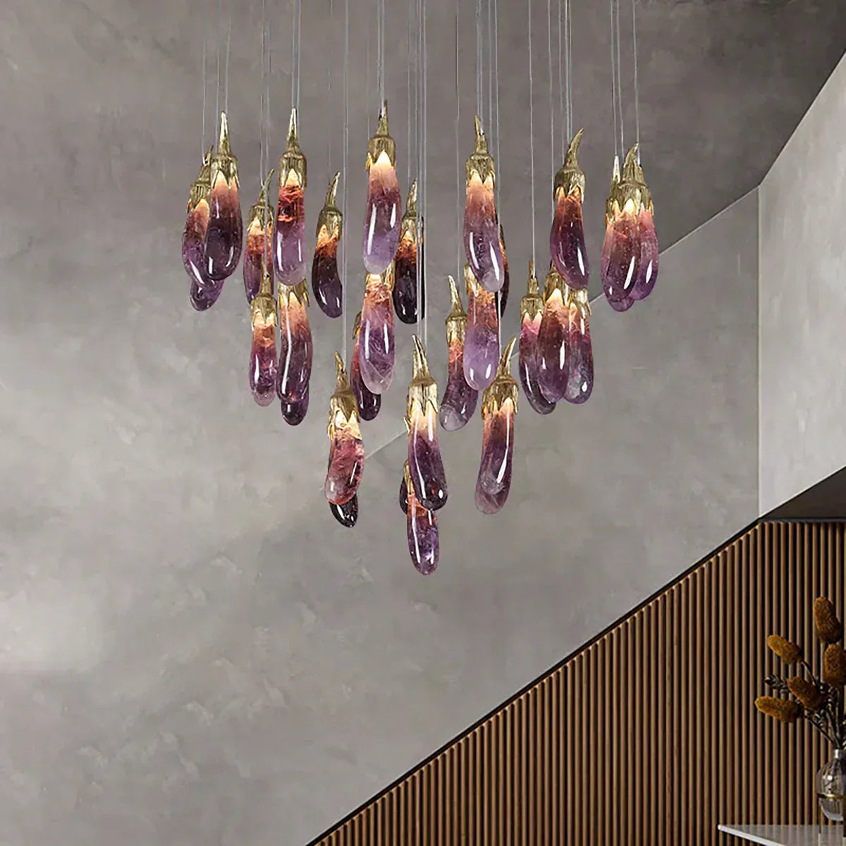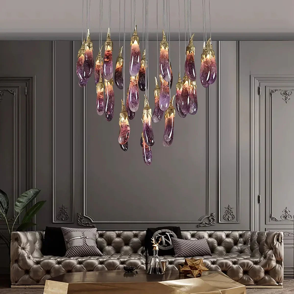 This Chandelier combines exquisite aesthetics with functionality. Crafted to resemble the elegant contours of an eggplant, this chandelier infuses spaces with a touch of whimsy and sophistication. Its rich purple hue adds vibrancy and warmth to any room, creating a captivating focal point. Perfect for those seeking unique decor, this chandelier seamlessly blends artistry with illumination, elevating interiors with its distinct charm.
