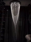The body of this chandelier is made of stainless steel and high quality K9 crystal material.It is designed into a luxurious atmosphere style. And its shape is full of creativity and novelty, combined by a string of crystal beads, the inner circle around a circular stainless steel chassis to form an inverted cone, and then around a circle of crystal chains outside, like a waterfall, forming a breathtaking array of light.Perfect for Spiral Staircase,Hotel Lobby,Loft,Villa,ect.