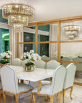 Round simple shape, with a sense of hierarchy, golden shining crystals neatly arranged on the surface of the lamp body, and crystal beads pendant in the body of the lamp below, this lamp is luxurious and elegant, especially suitable for decorating the living room, dining room, foyer, and other spaces, to create a sense of seniority.