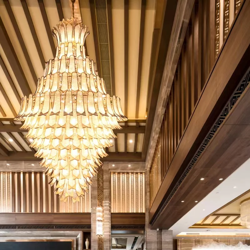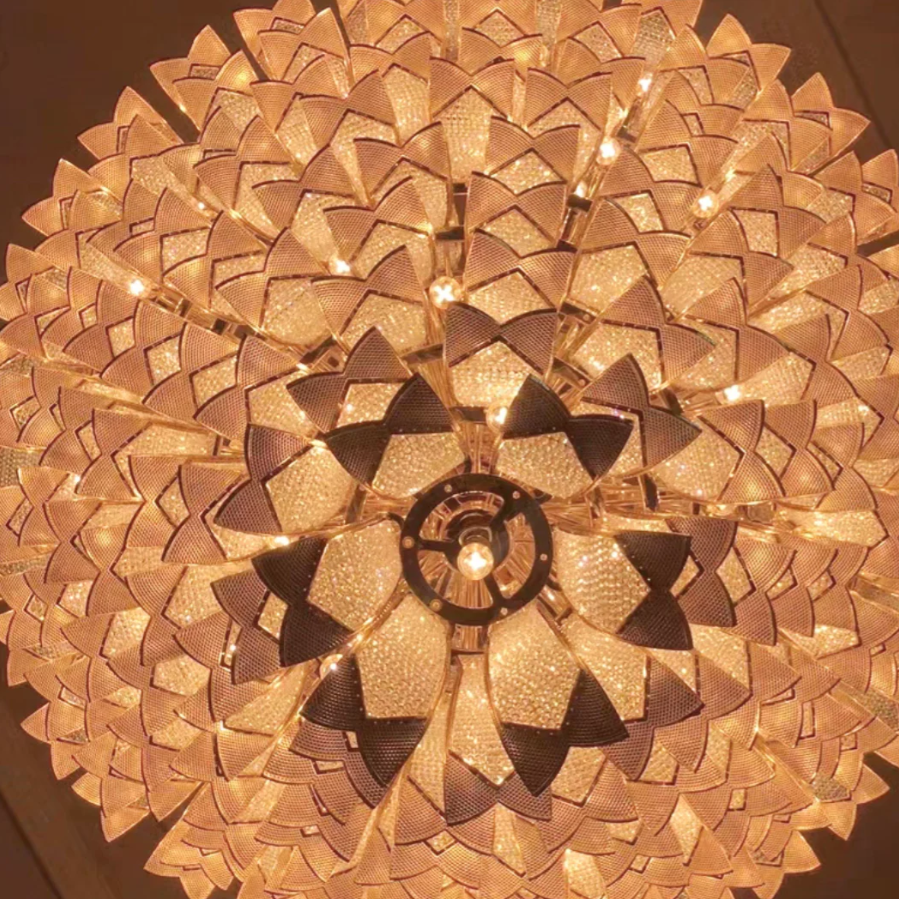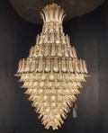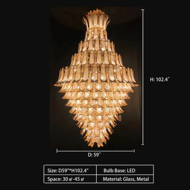 This multi-layered chandelier made of glass is a work of craftsmanship and beauty. Numerous sheets of upturned glass elements cascade down from the metal frame, folded like overlapping leaves in autumn. Suspended on a long adjustable chain, this chandelier is modern and ornate. The oversized installation creates an atmosphere of luxury and sophistication in two-story living rooms, villas, lofts and duplexes, or commercial areas such as hotel lobbies.