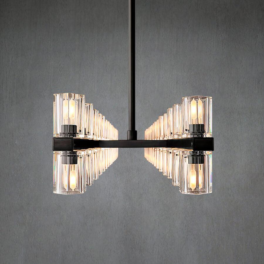 | The Arcochen collection is inspired by the shape and scale of industrial gears, where spokes intersperse with negative space in order to interlock with other gears. Here, the spokes are hexagonal forms juxtaposed with rounded interiors, beautifully crafted of crystal glass, running along a simple, solid metal frame. |