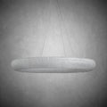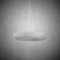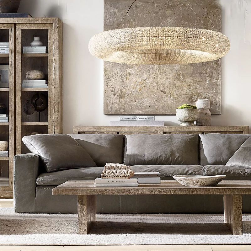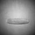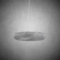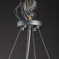 | The collection of chandeliers, inspired by French antique designs, features thousands of faceted, hand-wrapped smoked glass beads encasing a steel frame, forming a floating sphere suspended by steel cables. The beads filter and refract light, casting a soft, inviting glow. |