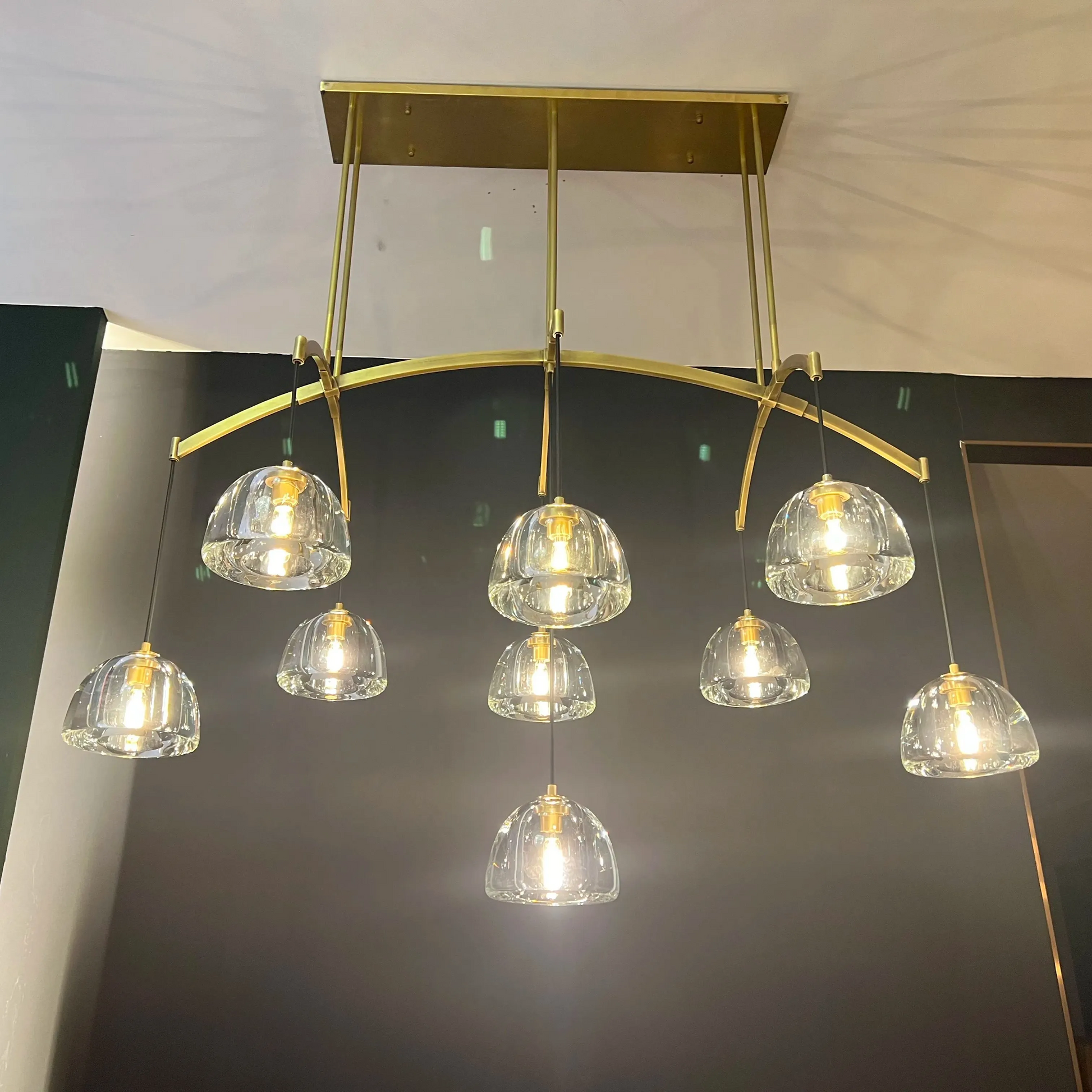 Evoking the 12th-century structure's flying buttresses, the fixture's winged armature holds aloft hemispheres of cross-cut glass. Lathe-carved from solid blocks of crystal and then hand polished, the thick, heavy domes play counterpoint to the solid brass frame's delicate arc – a vision at once fixed and fluid, strong and fragile. Viewed as an object in space, the silhouette creates a canopy of light overhead.