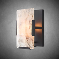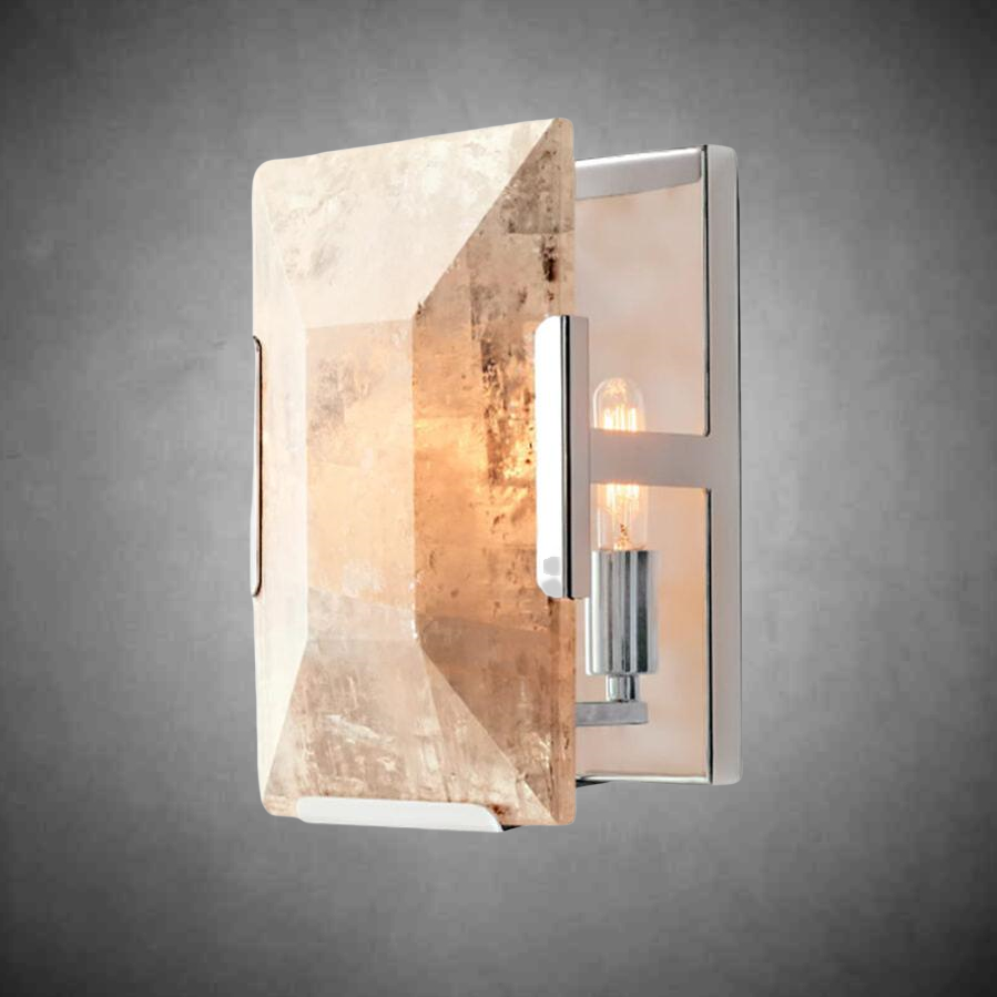 The collection showcases natural beauty with a minimalist sensibility.Translucent calcite is cut in sheer and faceted slabs, each held in place by a slender mount in our dramatic collection. Warm light shines through the stone, accentuating the play of crystal formations within.