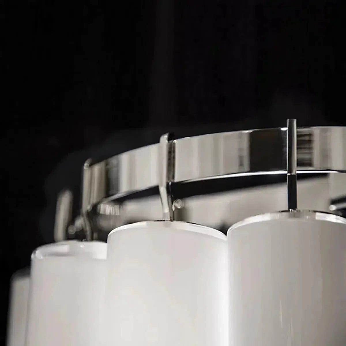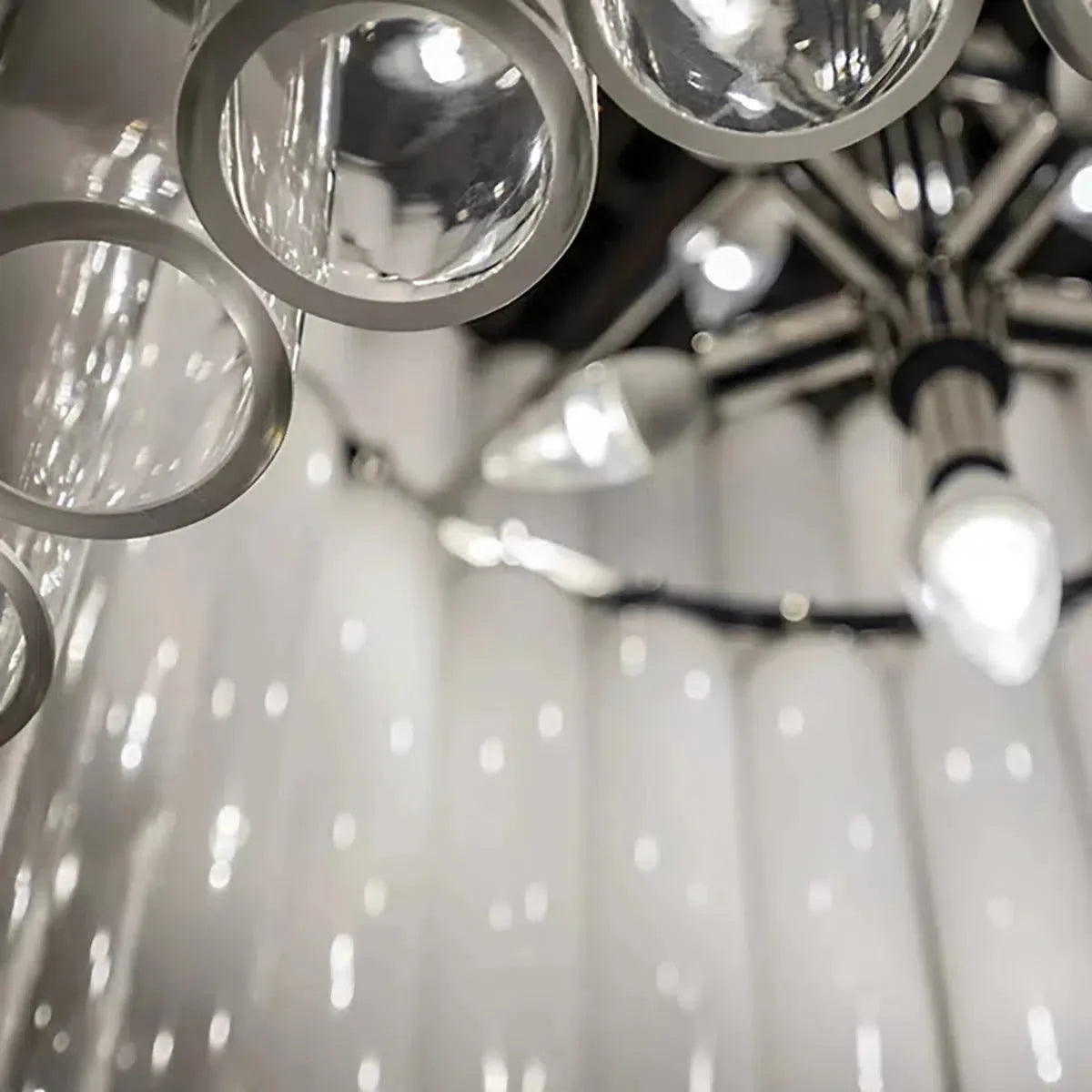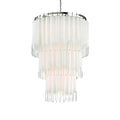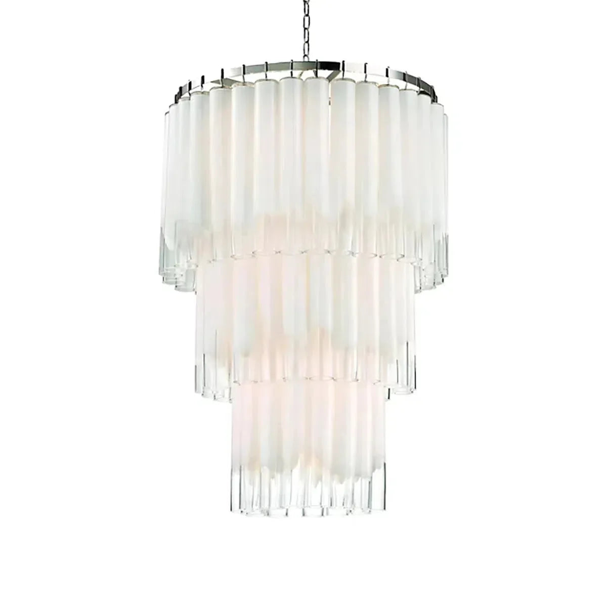 Each of the glass tubes in the Morna chandelier is imperfect, frosted opalescent at the top and perfectly clear at the bottom. The sheen of the outer layer gives them a glossy sheen that creates a mysterious and seductive diffused effect as light streams from candelabra bulbs perpendicular to each layer of glass tubes.Morna adds a 21st-century twist to a modernist classic.