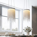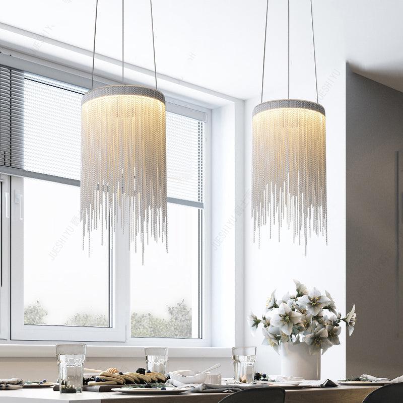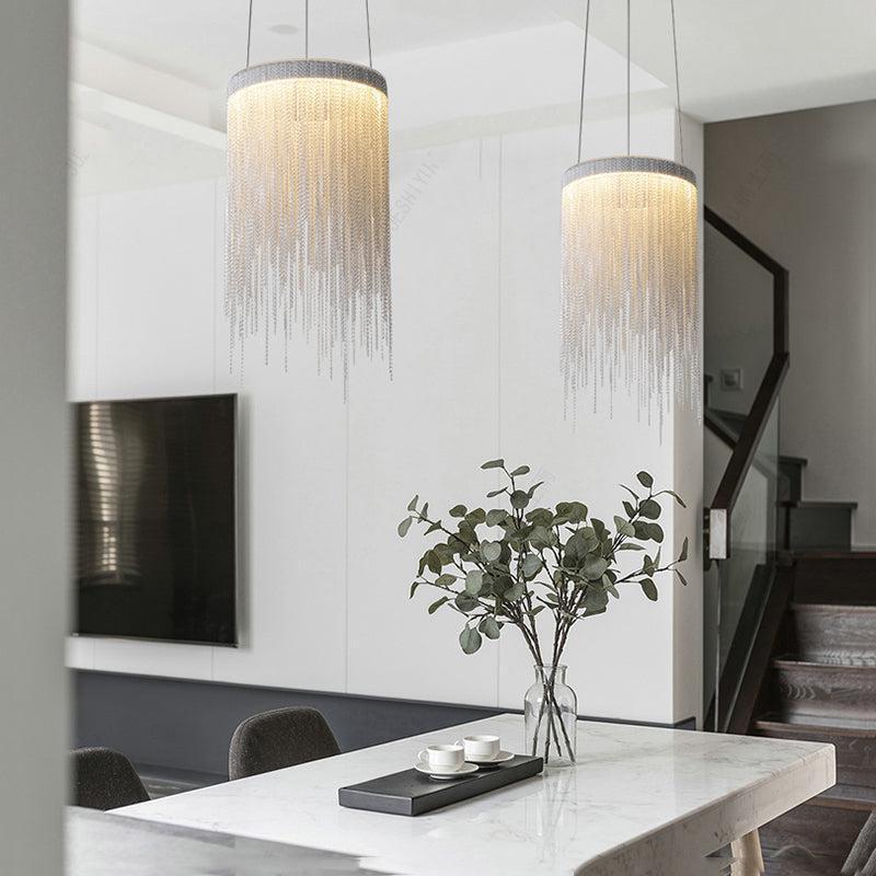 | Let the Fiona bring some spark to your dining room. With an industrial style that contrasts bold and delicate, this lamp fits any aesthetic and a range of spaces. Adorned with chains and tassels that remind us of bohemian style, this lamp can bring a hint of nature indoors. A perfect fit for modern spaces. |