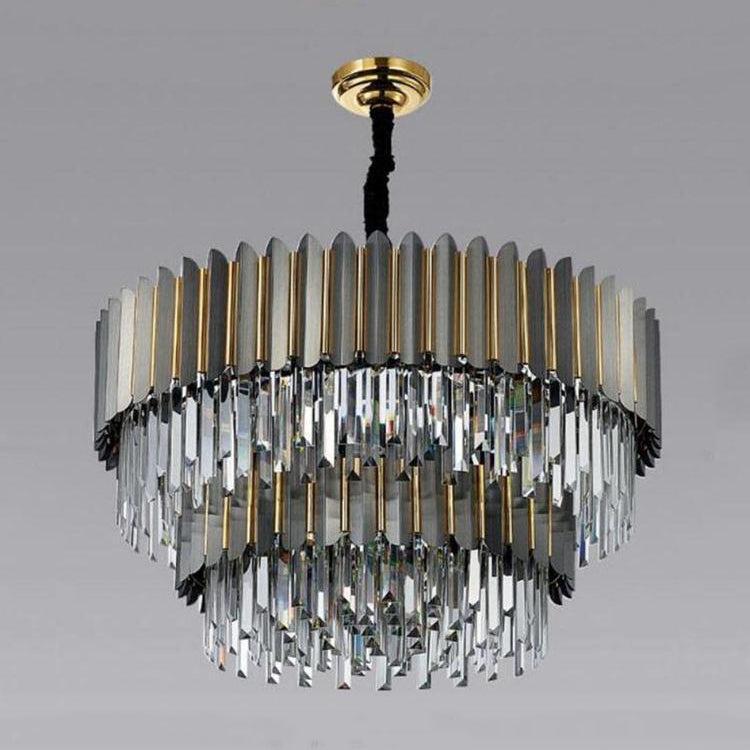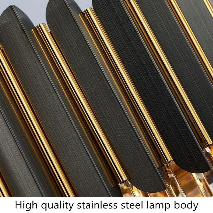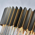 | This incredible piece commands the attention of everyone who enters the room. A truly stylish modern crystal chandelier that fits perfectly in any space in your home. The color of the frame is very similar to gunmetal gray with gold inlay trim detail between the strips. |