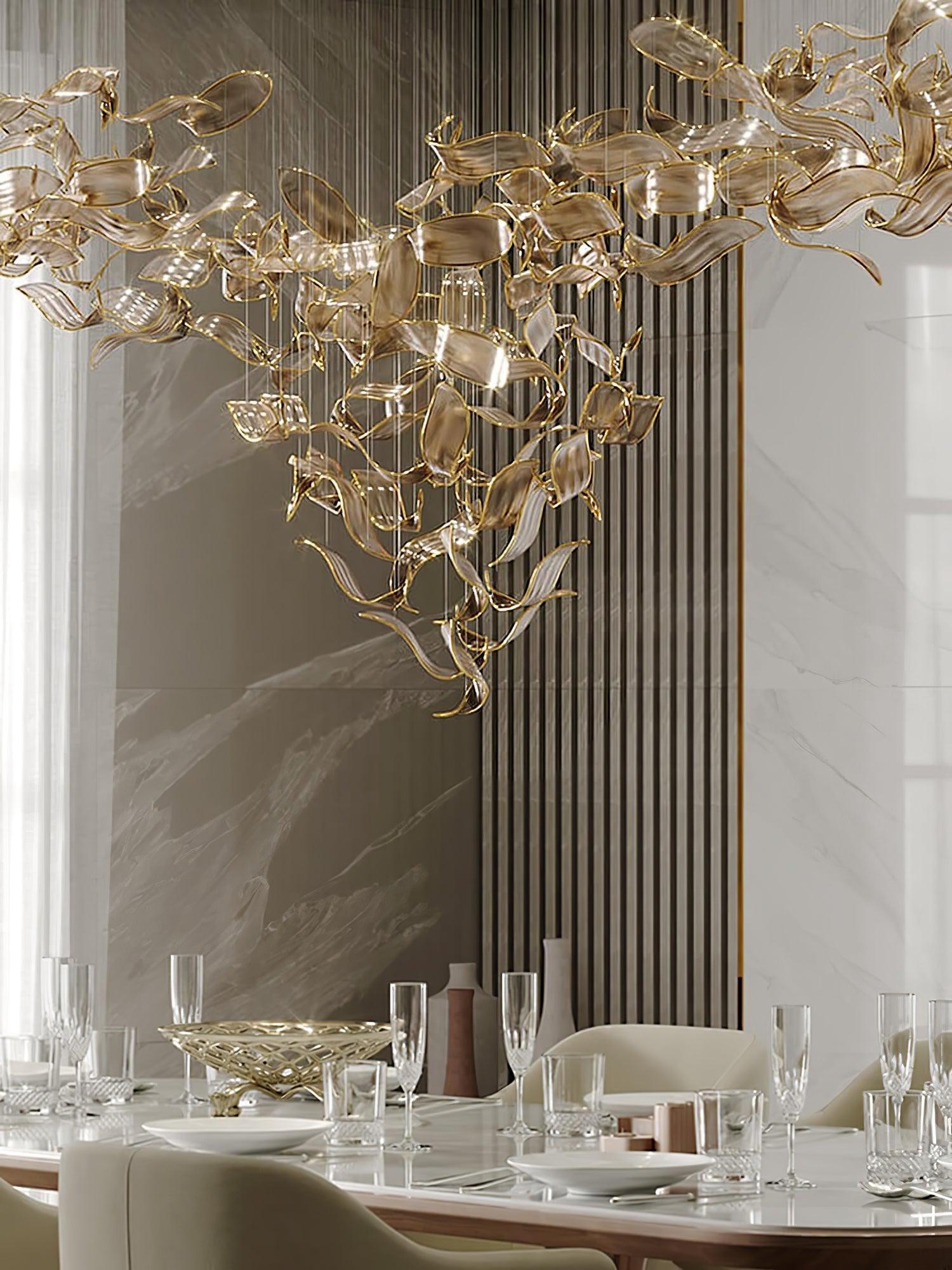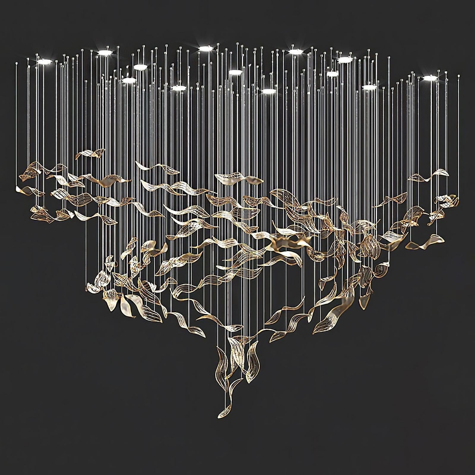 The Wave Floating Leaf Chandelier is expertly crafted for a unique and elegant lighting experience. With a stunning wave design and floating leaves, this chandelier adds a touch of nature to any space. Made with high-quality materials and attention to detail, it is a beautiful addition to any home or business.