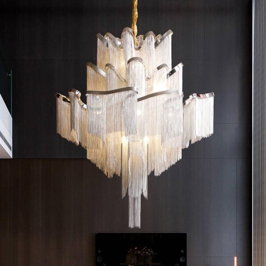 Besides the general rule that the chandelier’s bottom should be at least 7 and a half feet away from the floor. For two stories, what you also need to consider is how will it look from the second floor. In general, staircase chandeliers will be a good choice for space. In term of placing, below are two commonly seen guidance:
