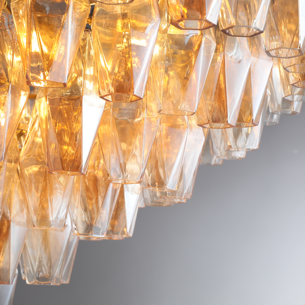 | This chandelier is suspended from a tiered steel frame with dozens of hand-blown glass polyhedra on individual hooks. Illuminated from within, the faceted chandeliers dramatically reflect and refract light. A tribute to the Italian lighting style of the 1950s with this minimalist style. |