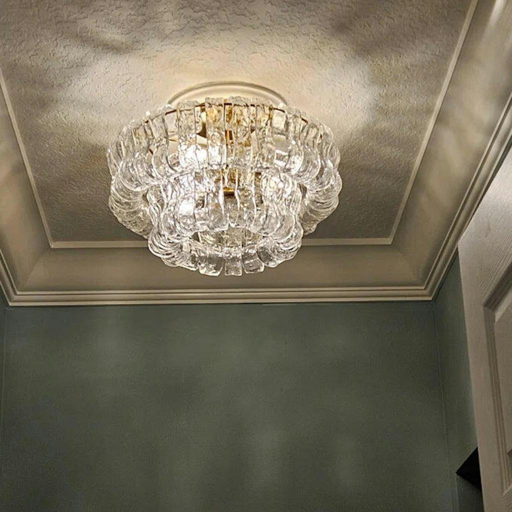 Inspired by the elegance of Italian glassmaking, the Ghiaccio Flush Mount Light showcases a refined blend of texture, warmth, and craftsmanship. Each piece features gracefully curved, textured glass panels that softly diffuse the light, creating an inviting glow. Finished in plated brass, this design adds a timeless touch of sophistication to modern and classic interiors alike.