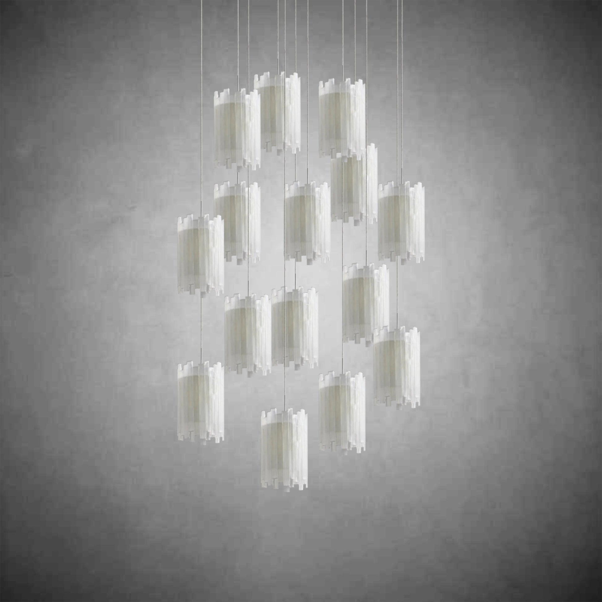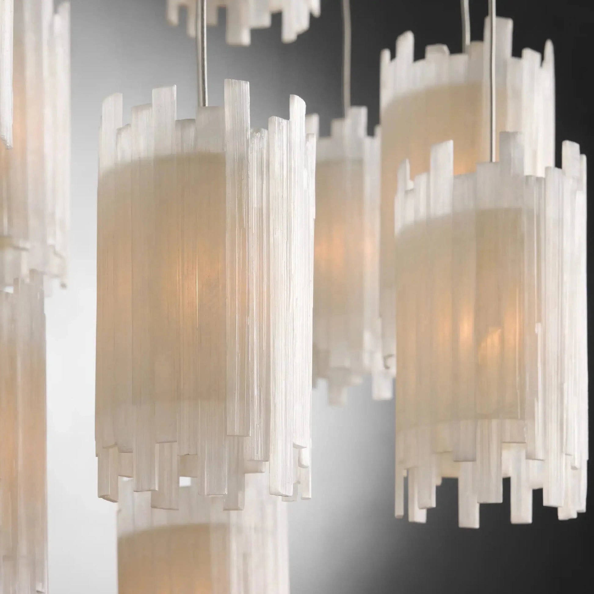 - Made from PVC cables featuring a silver finish with a clear protective lacquer and complemented by pendant shades crafted from natural selenite stone.