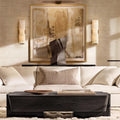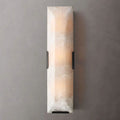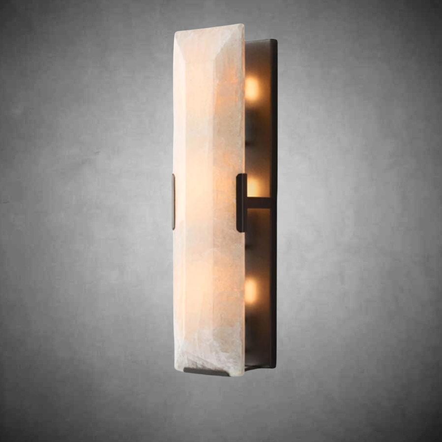 The collection showcases natural beauty with a minimalist sensibility.Translucent Alabaster is cut in sheer and faceted slabs, each held in place by a slender mount in our dramatic collection. Warm light shines through the stone, accentuating the play of crystal formations within.