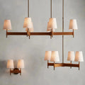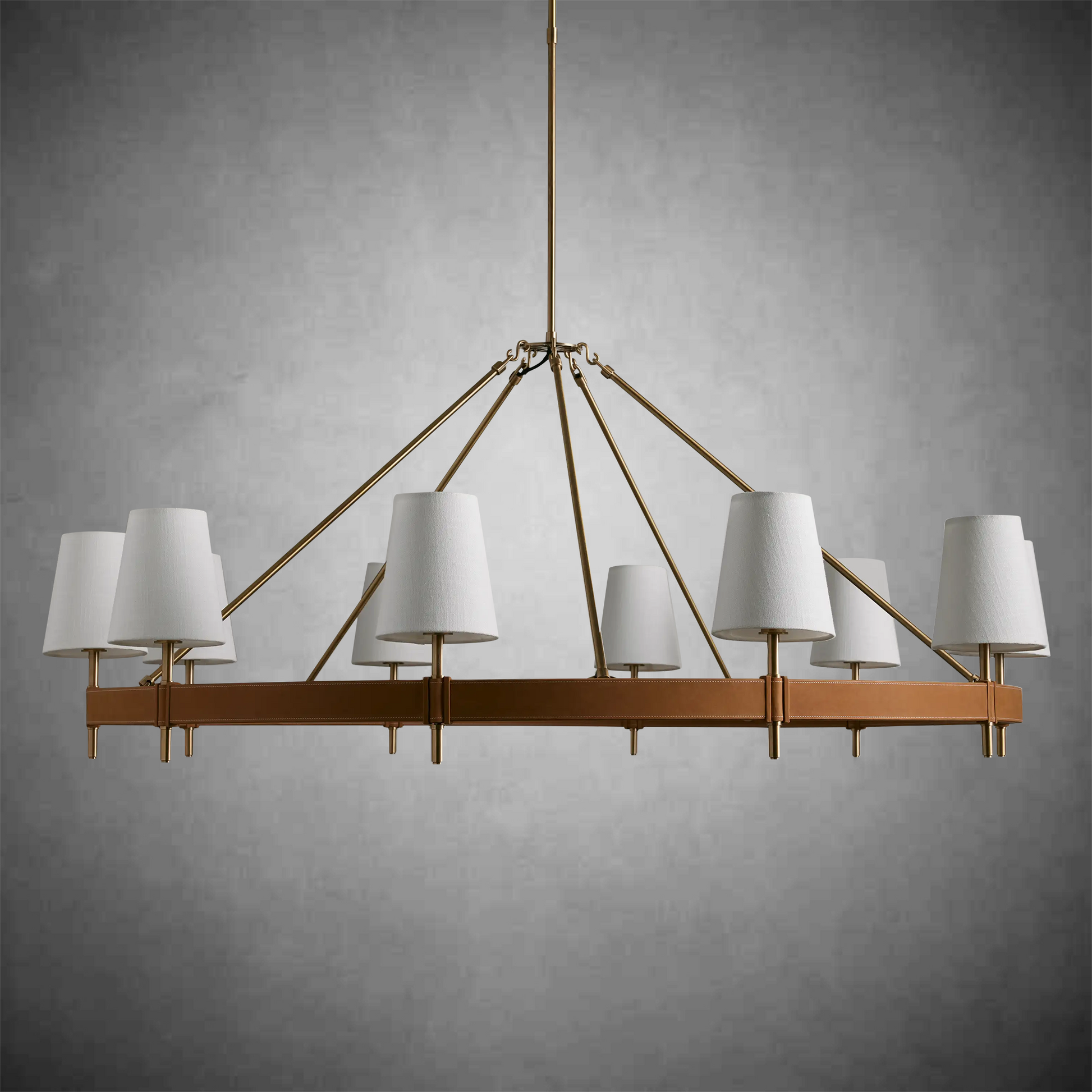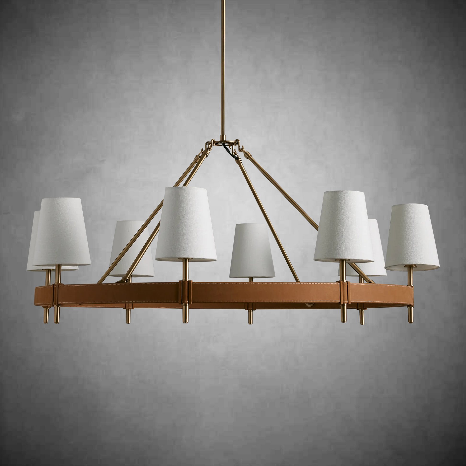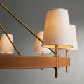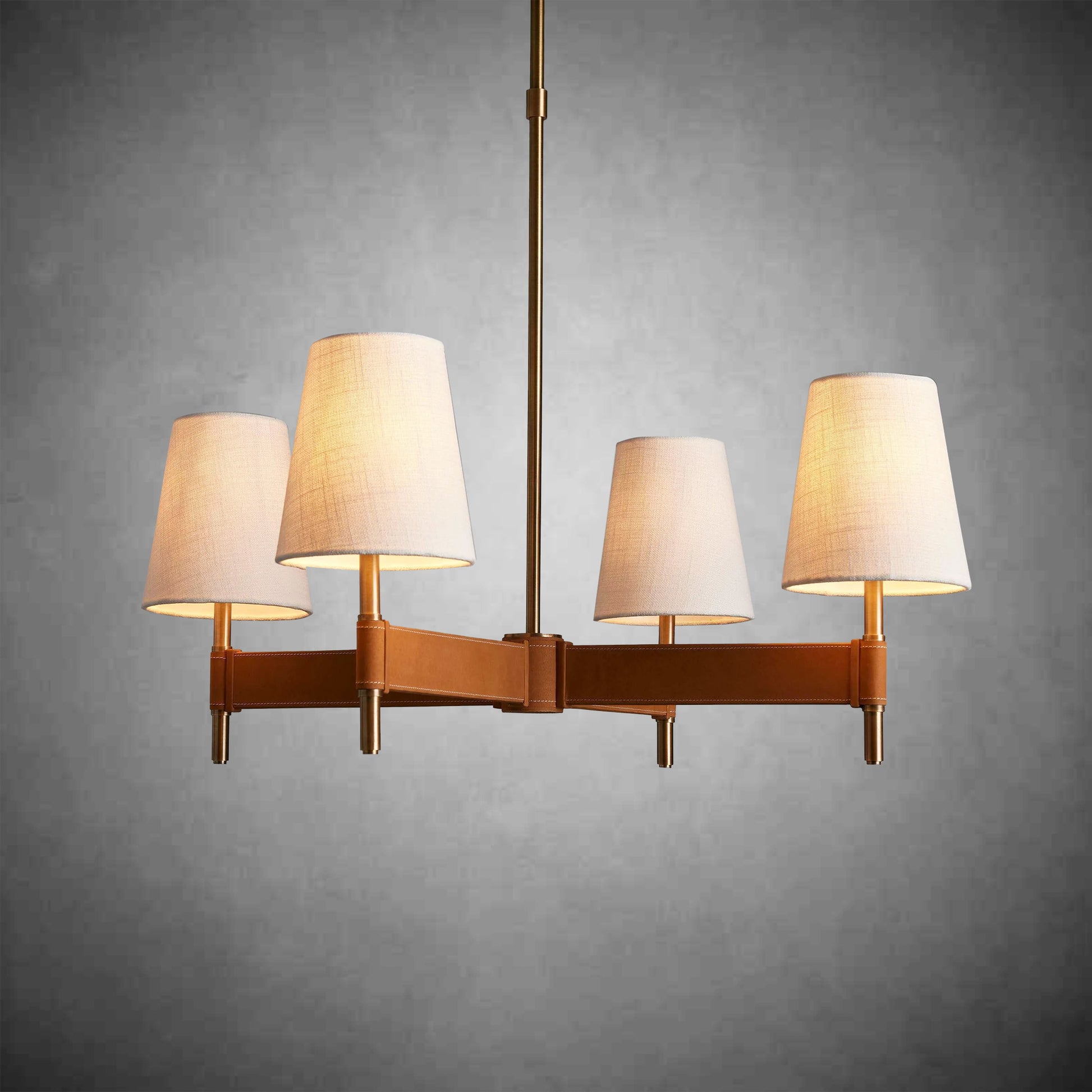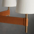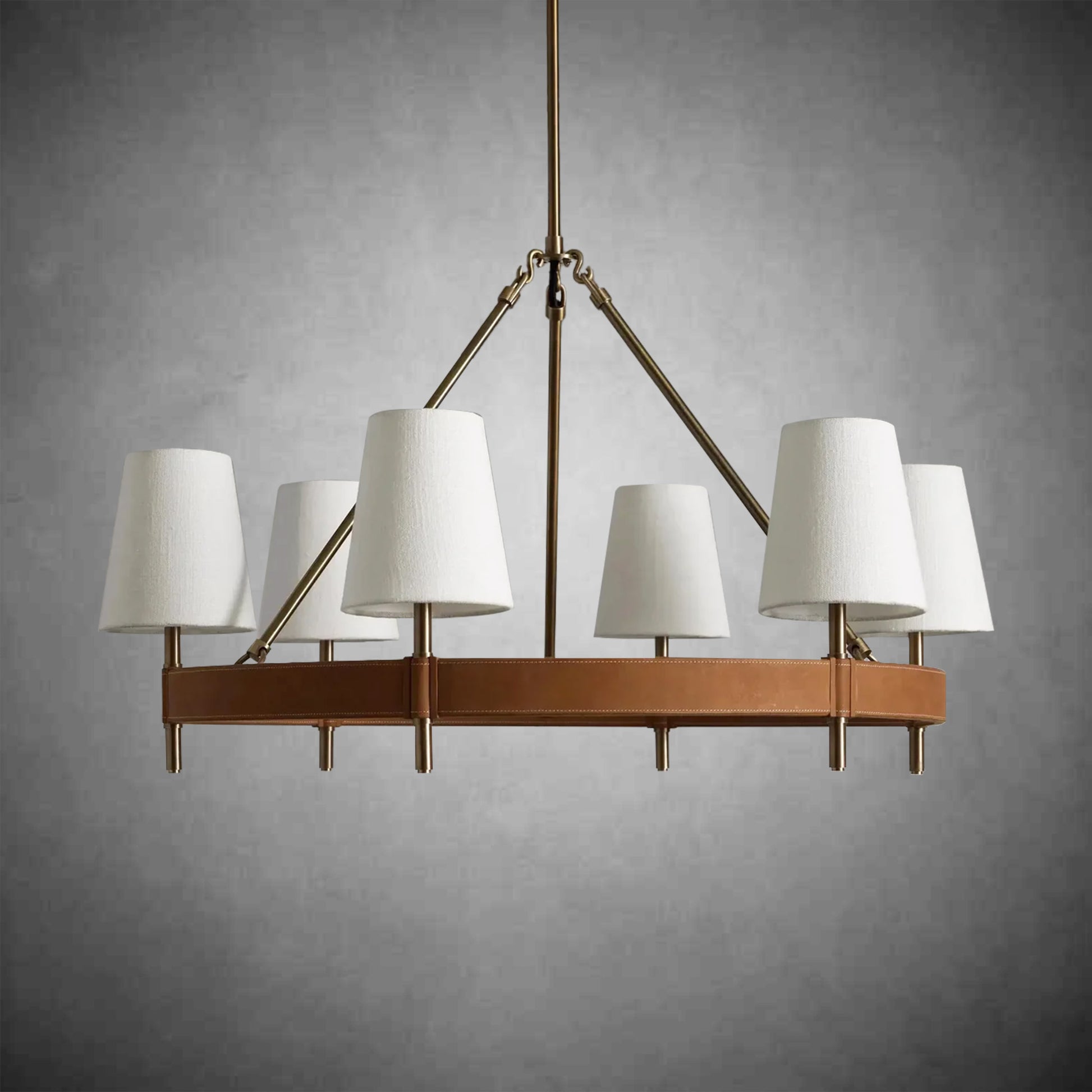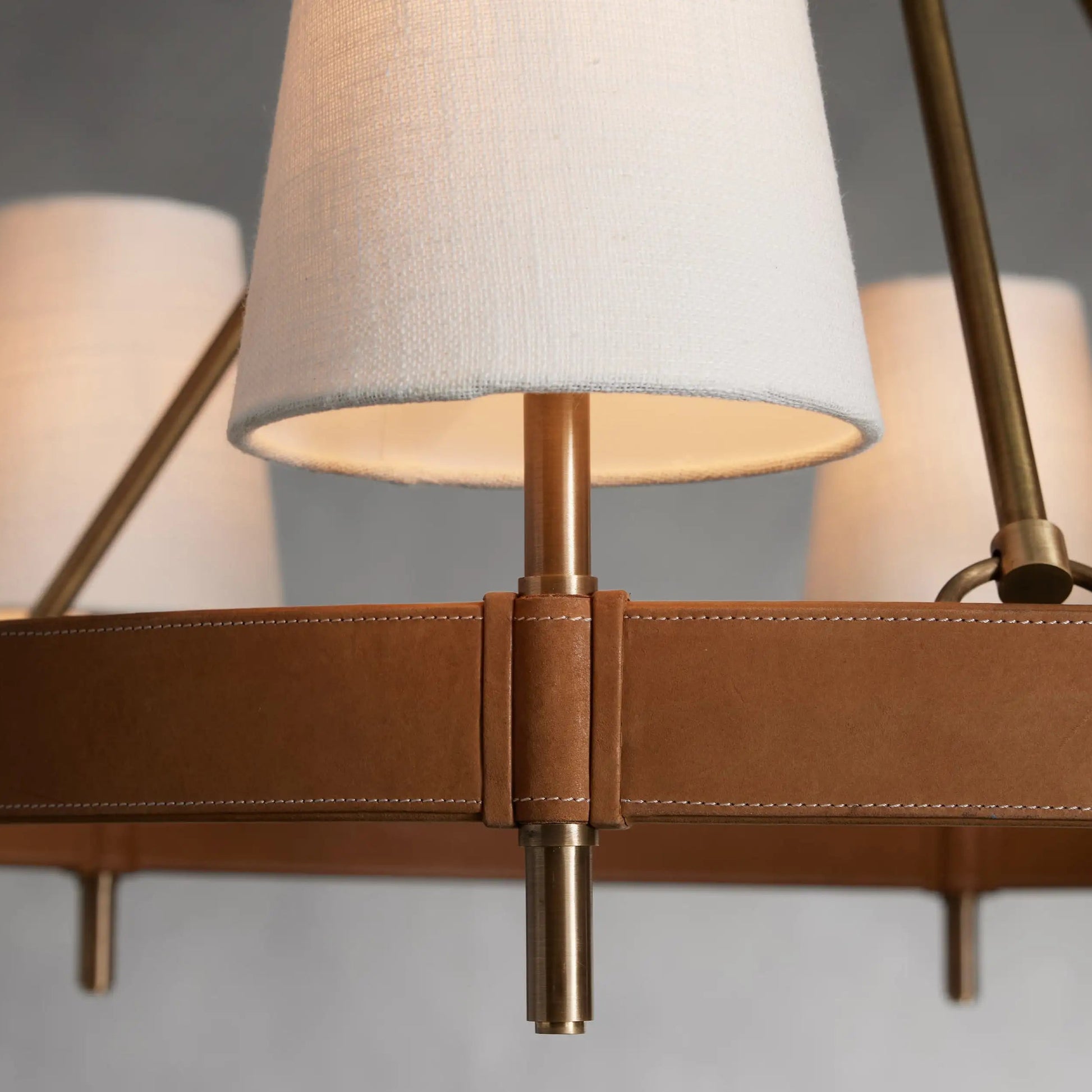 - Crafted from brass with an antiqued finish complemented by leather details and white linen shade.